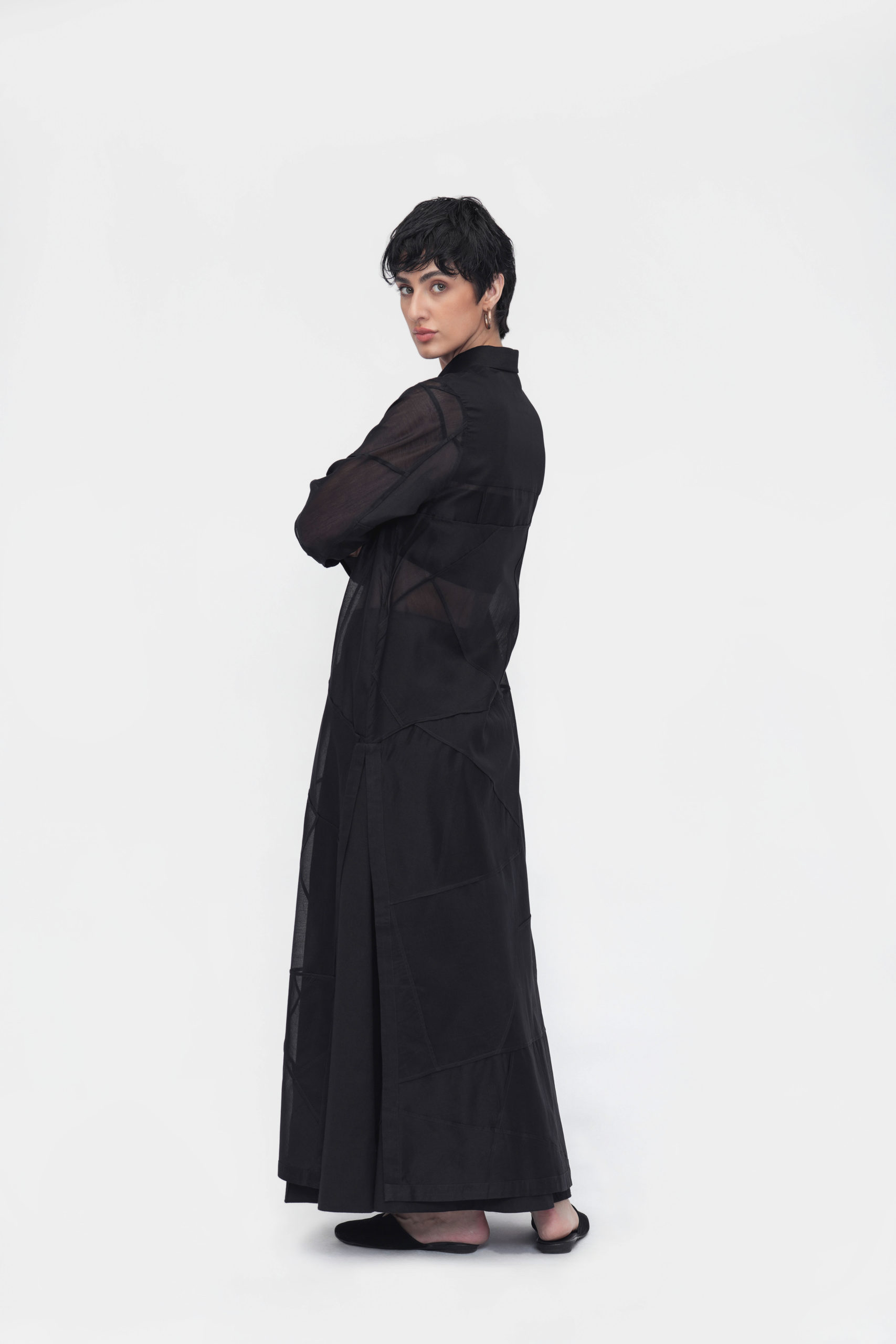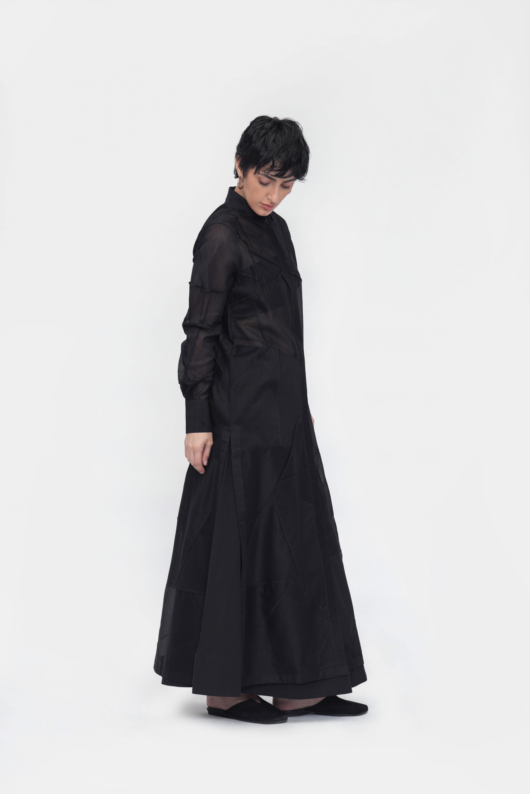 A relaxed-fit dress with a point collar and a full concealed placket. Finished with full sleeves, side slits, and a structured back yoke. Crafted in patchwork fabric using delicate French seams.