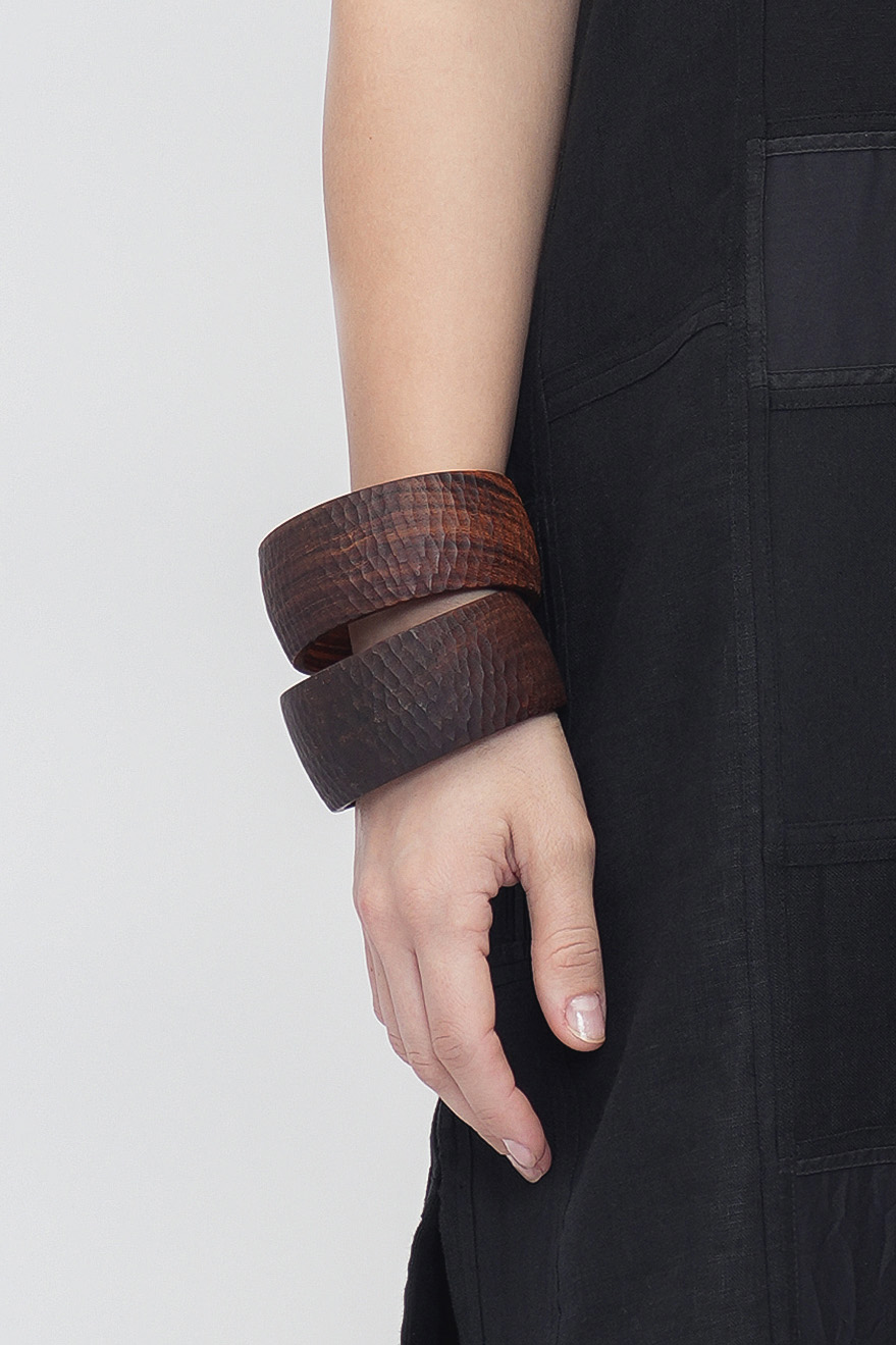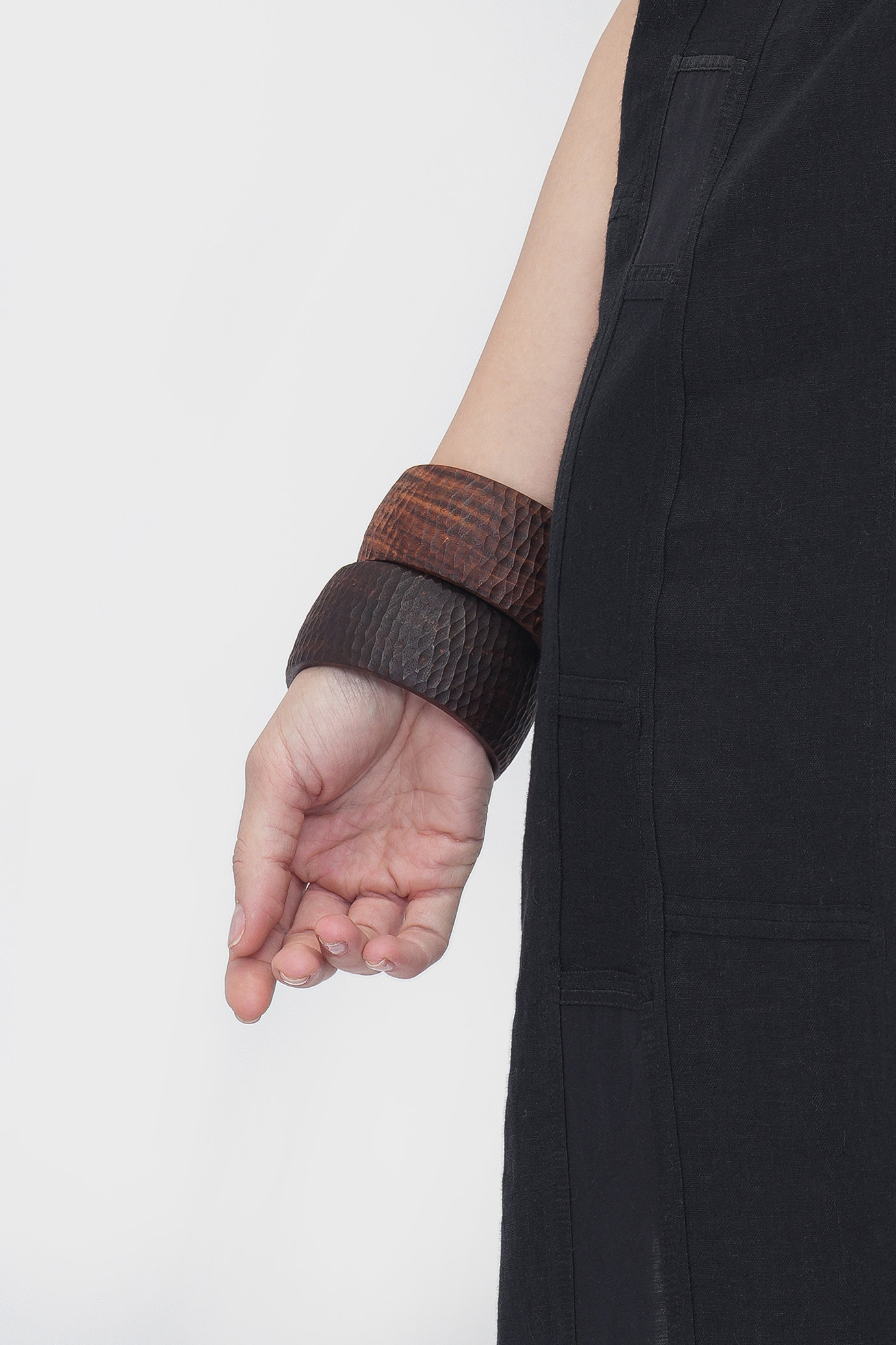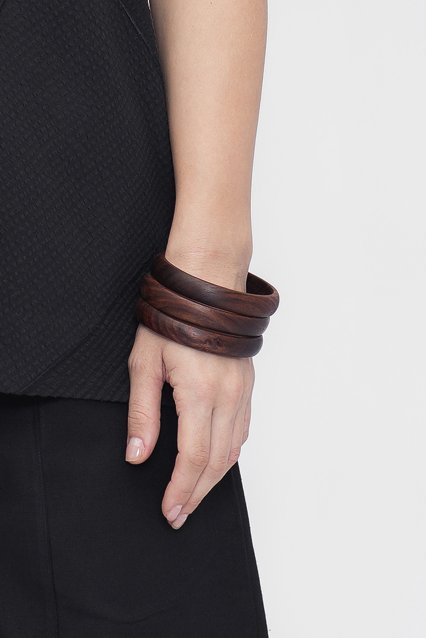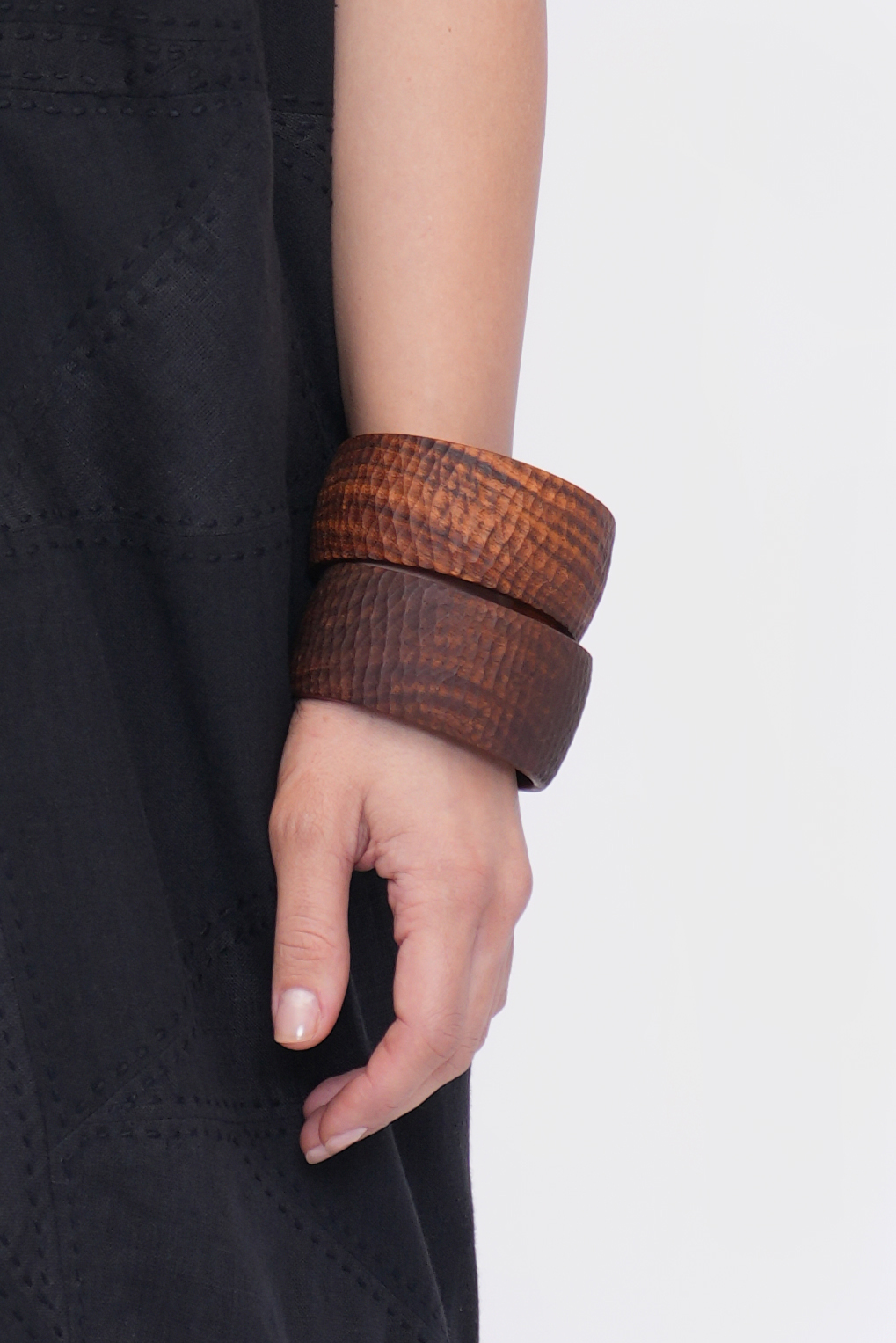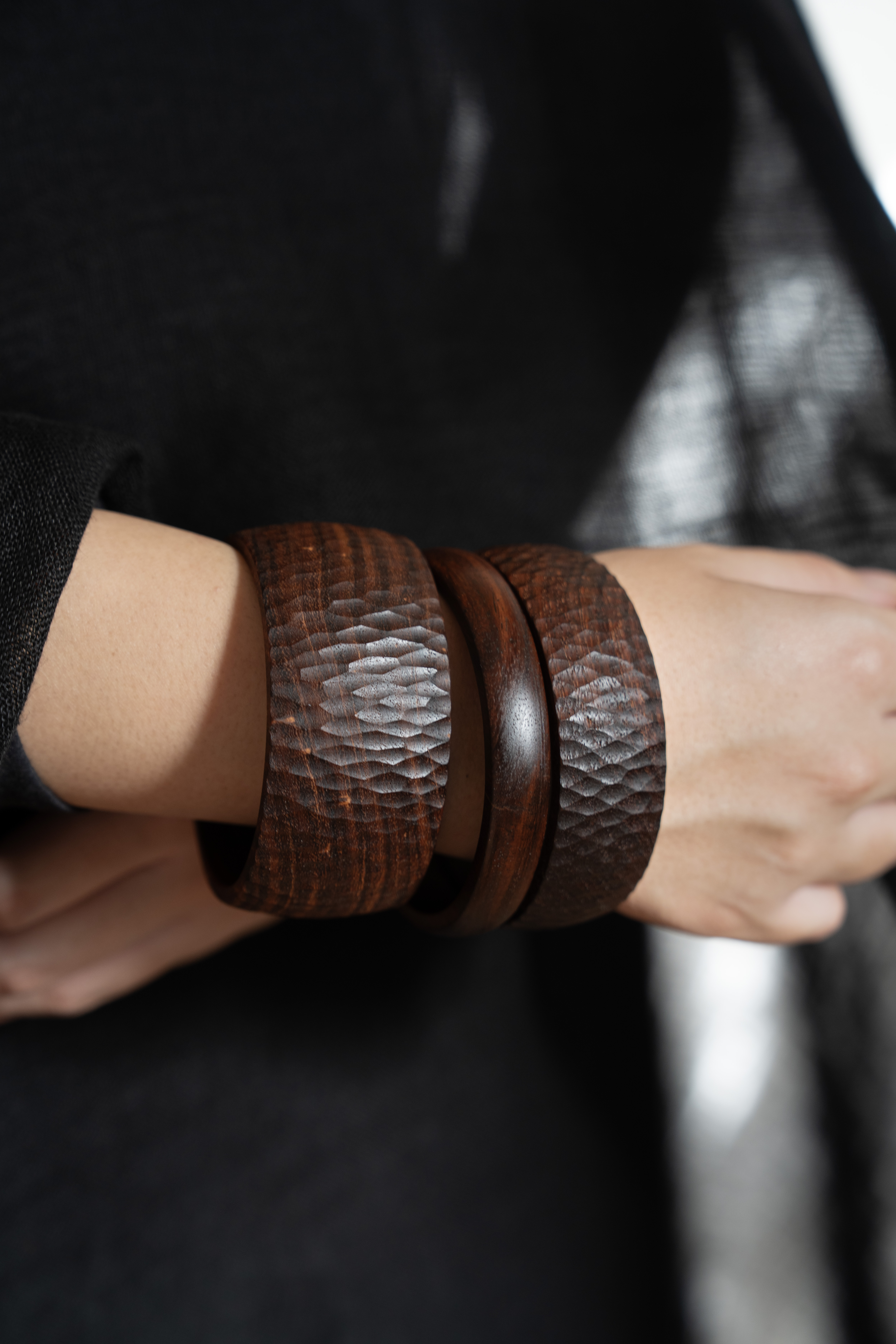A set of three handcrafted bangles carved from carefully repurposed Sheesham wood. Each bangle features a delicate hand-carved texture and unique variations, celebrating the charm of artisanal craftsmanship. Each set includes three sizes (1.5″, 1″, 0.5″) with a smooth 0.3 cm thickness.
