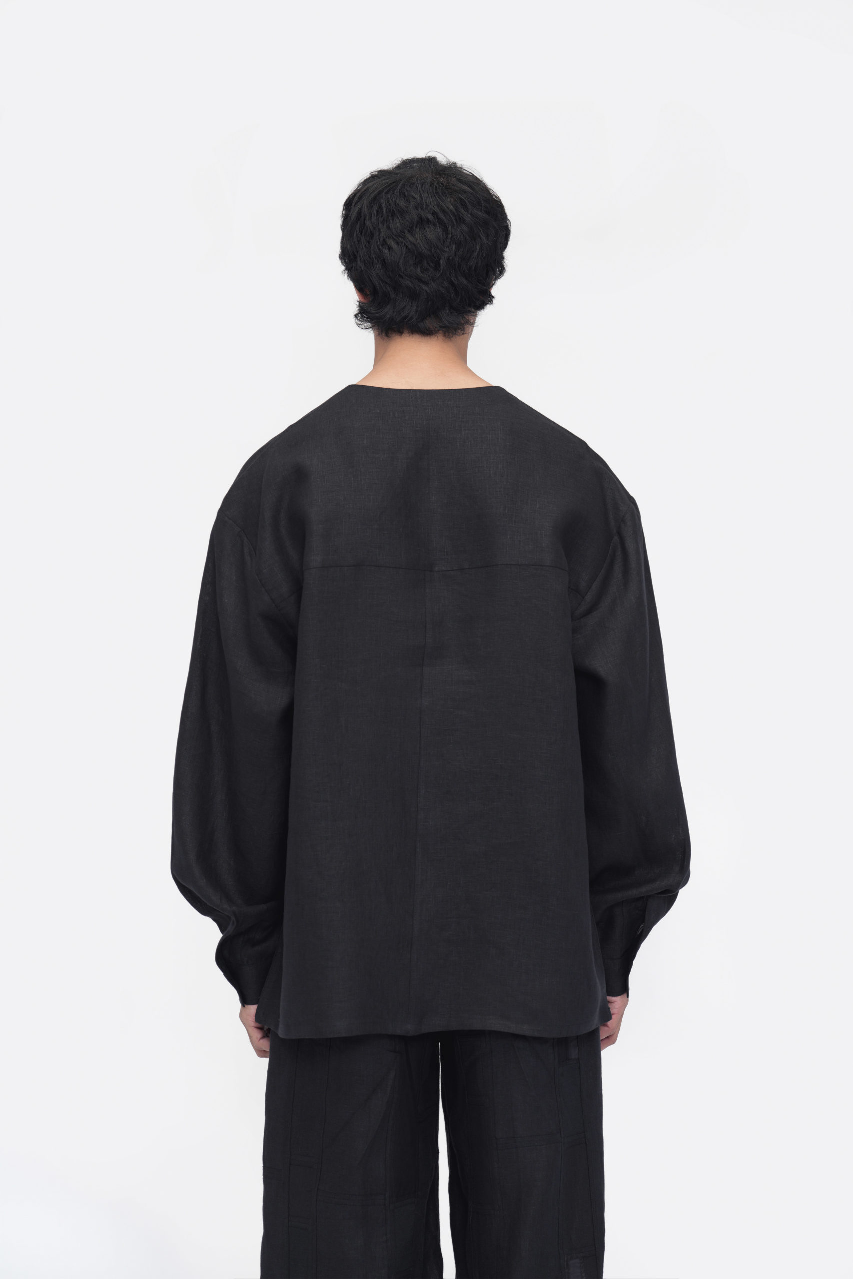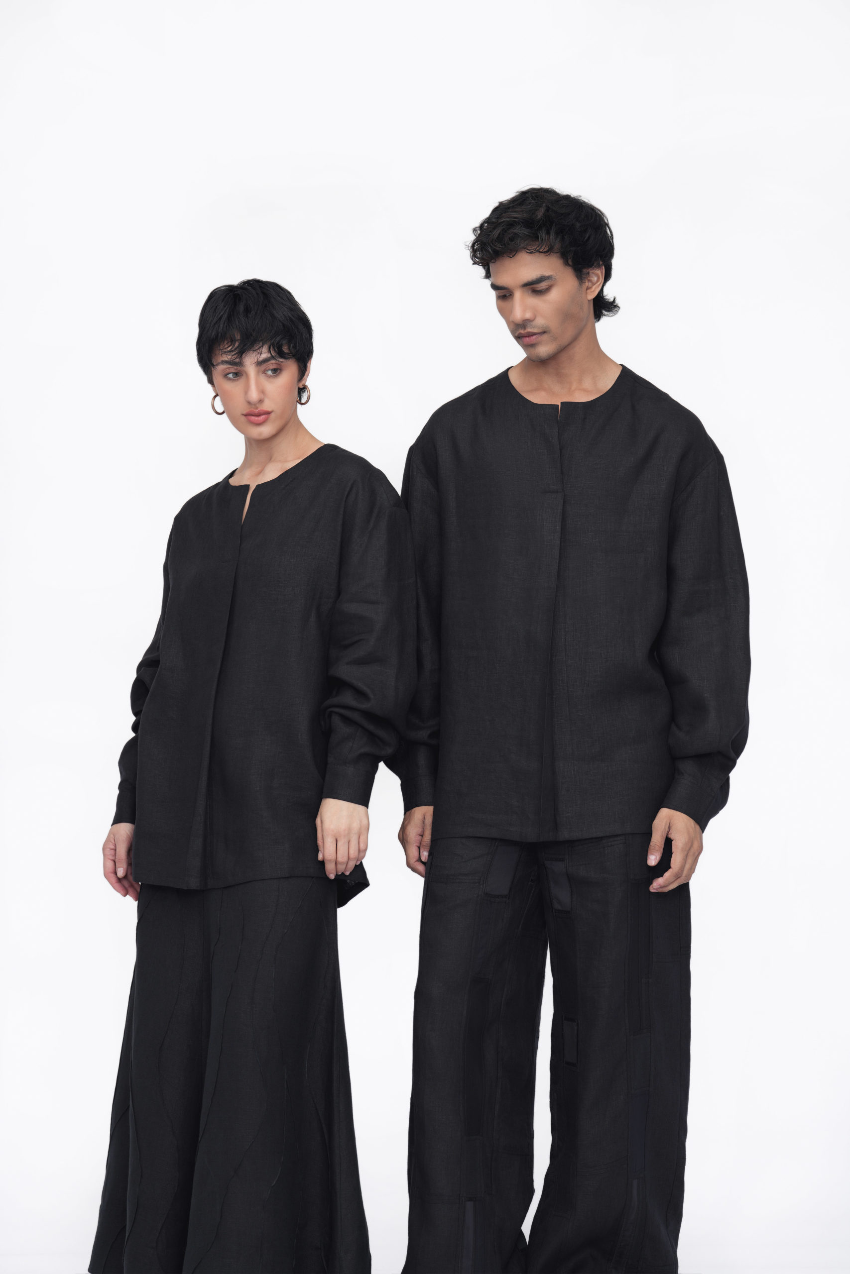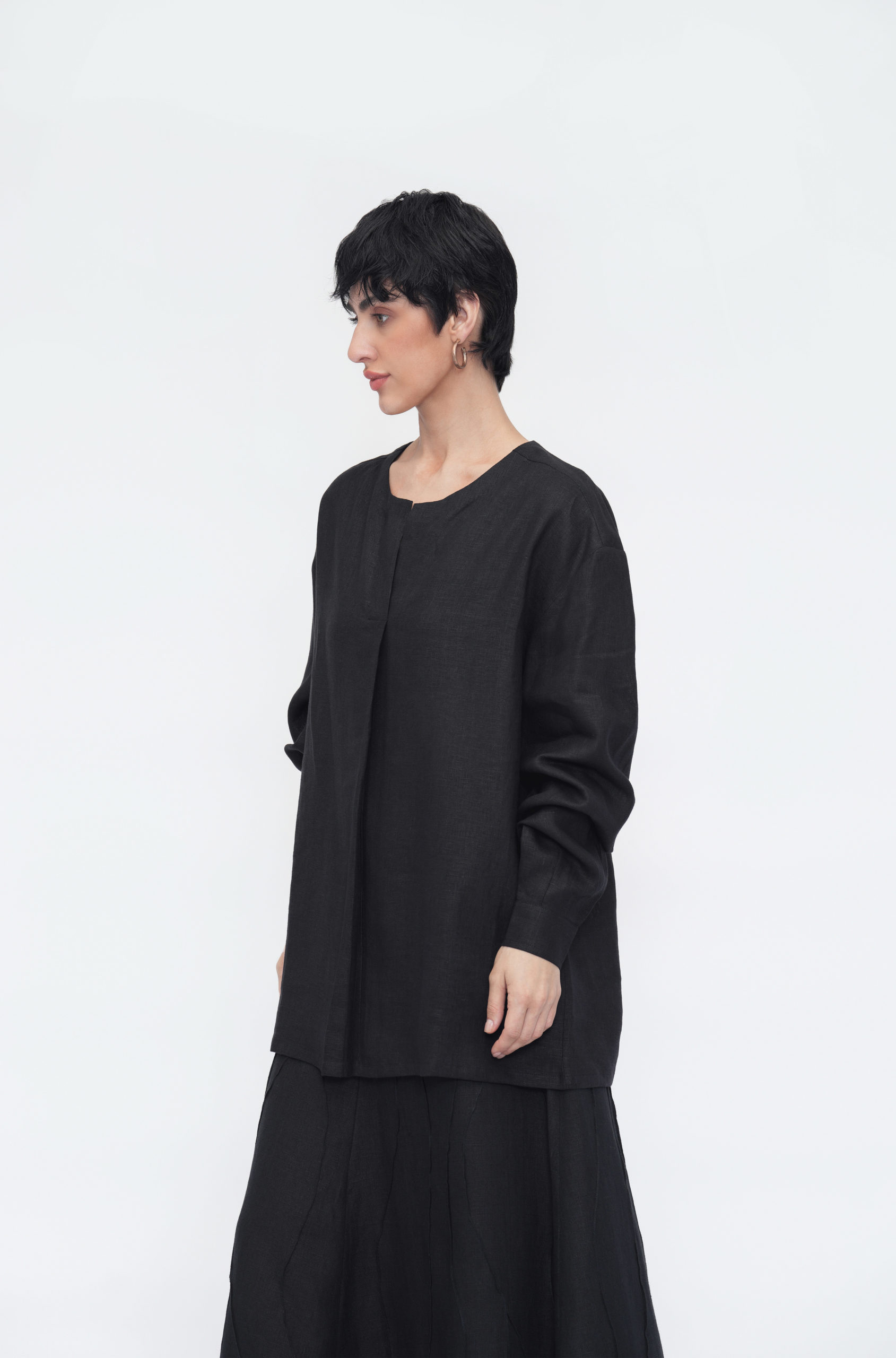 A unisex shirt in fine 100% linen with an oversized silhouette. Designed with a round neck, top-opening false placket, and bishop sleeves with cuffs. Finished with a back yoke for soft structure and subtle volume.