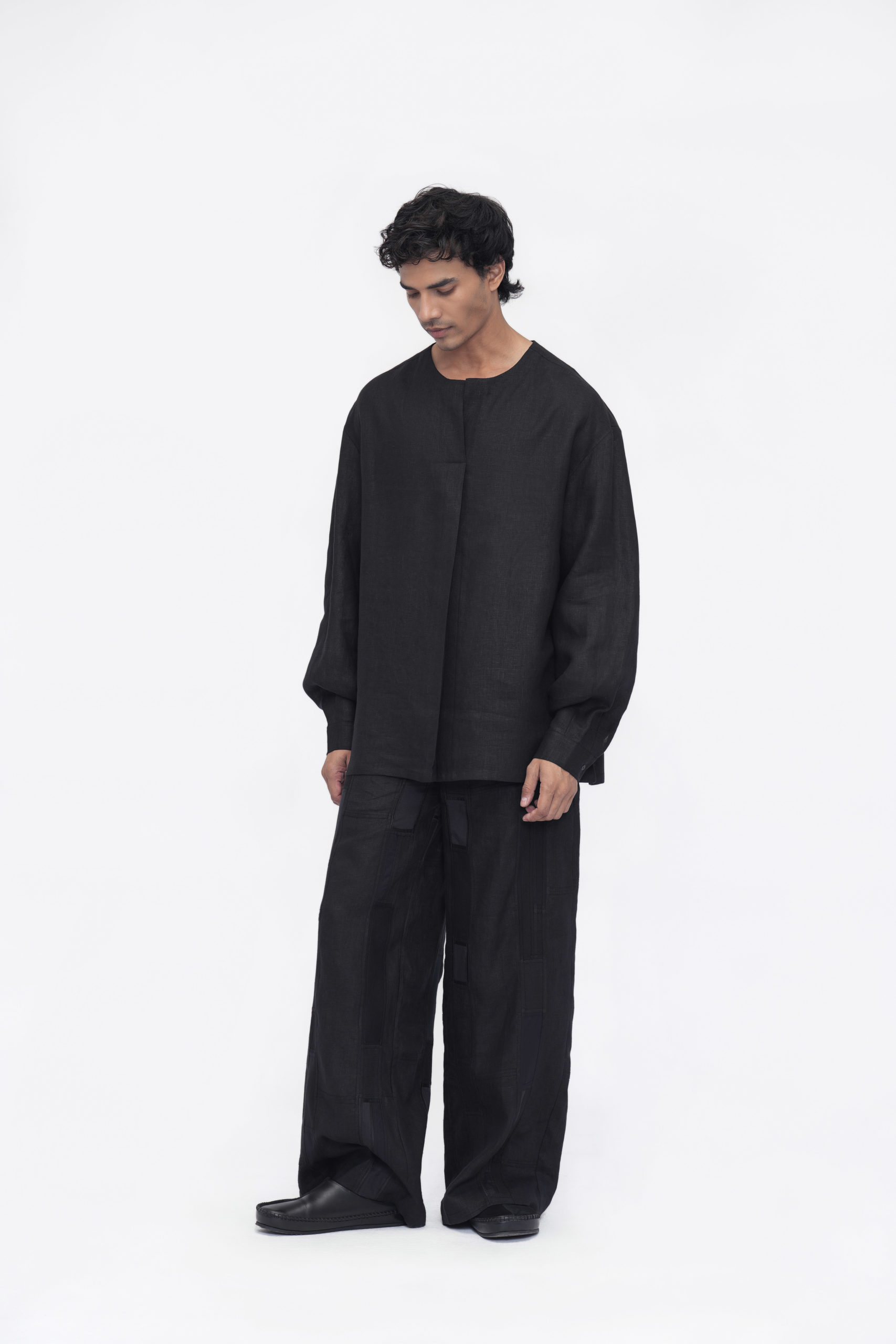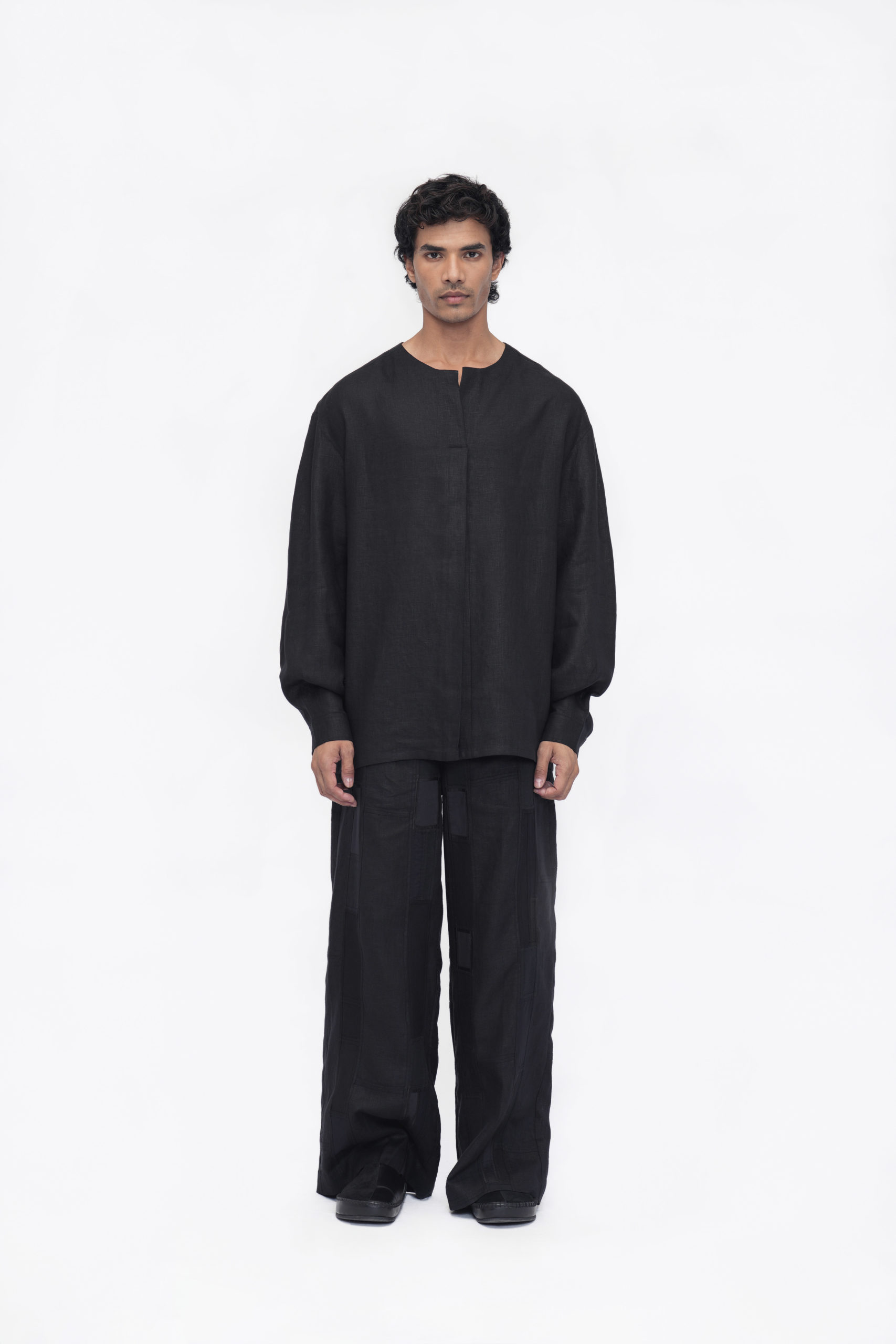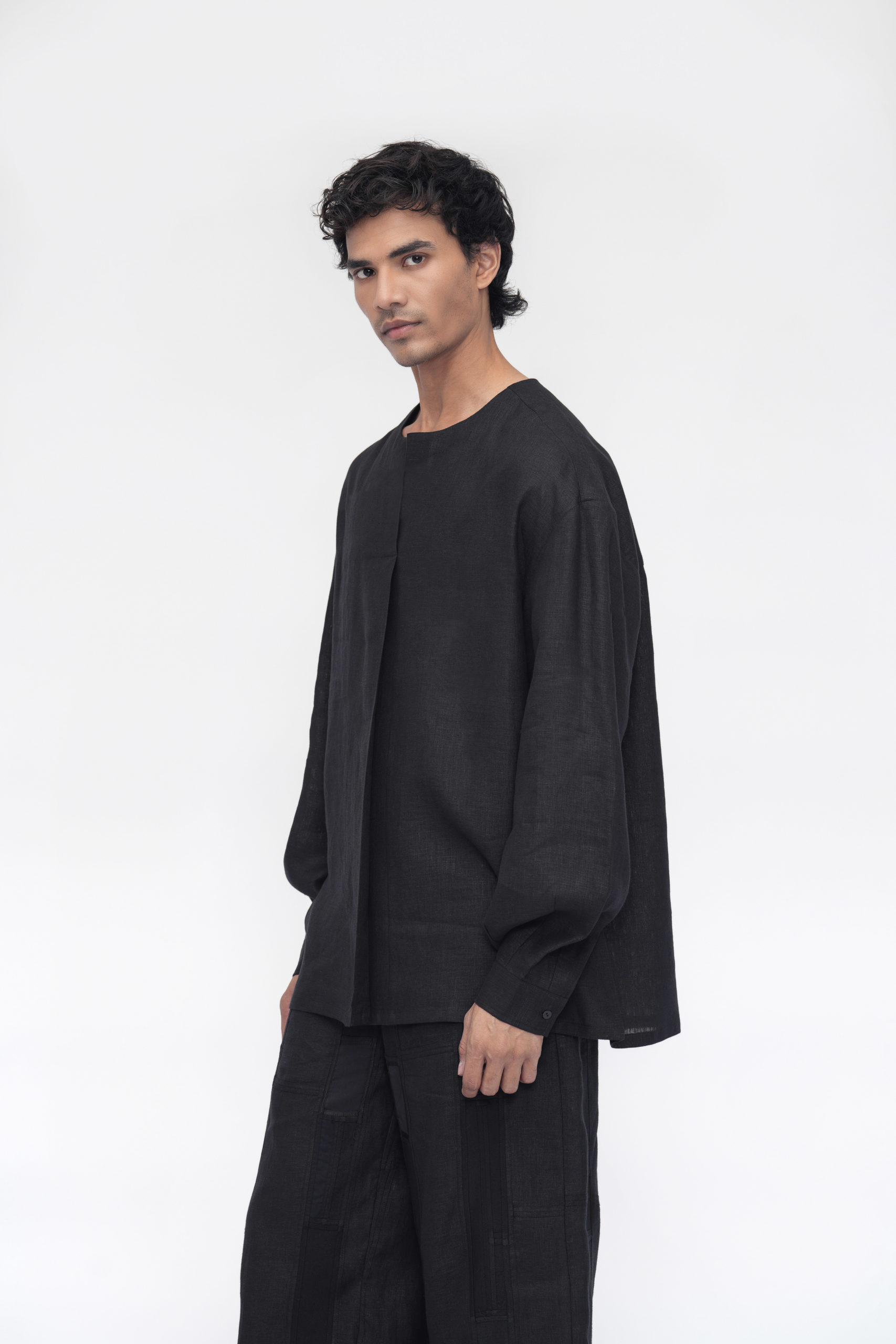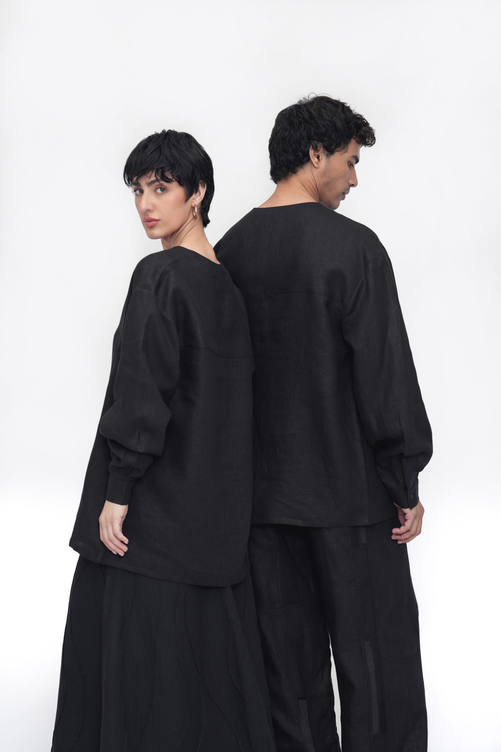 A unisex shirt in fine 100% linen with an oversized silhouette. Designed with a round neck, top-opening false placket, and bishop sleeves with cuffs. Finished with a back yoke for soft structure and subtle volume.