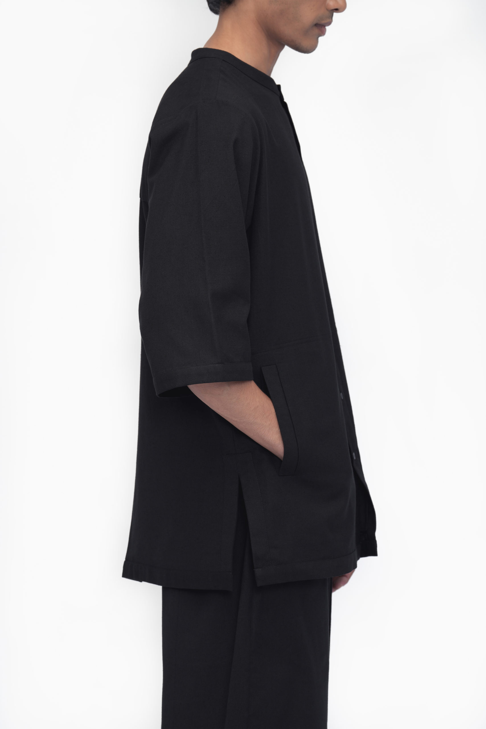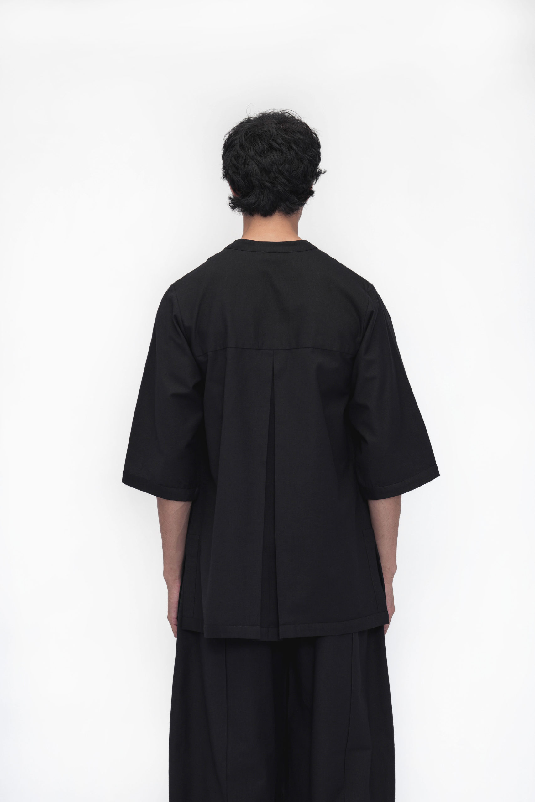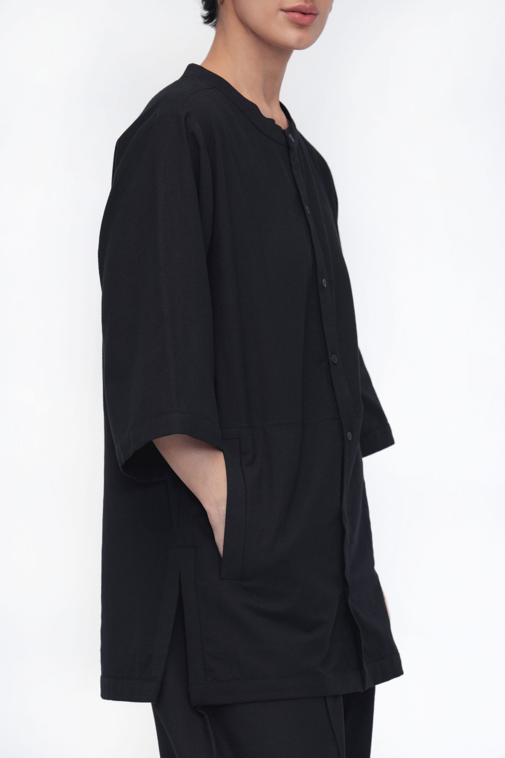Ichi is a relaxed-fit unisex shirt featuring a band collar, binding finish, and practical front welt pockets. With three-quarter sleeves, a back yoke with box pleat, and side slits, it combines comfort with subtle structure for effortless style.