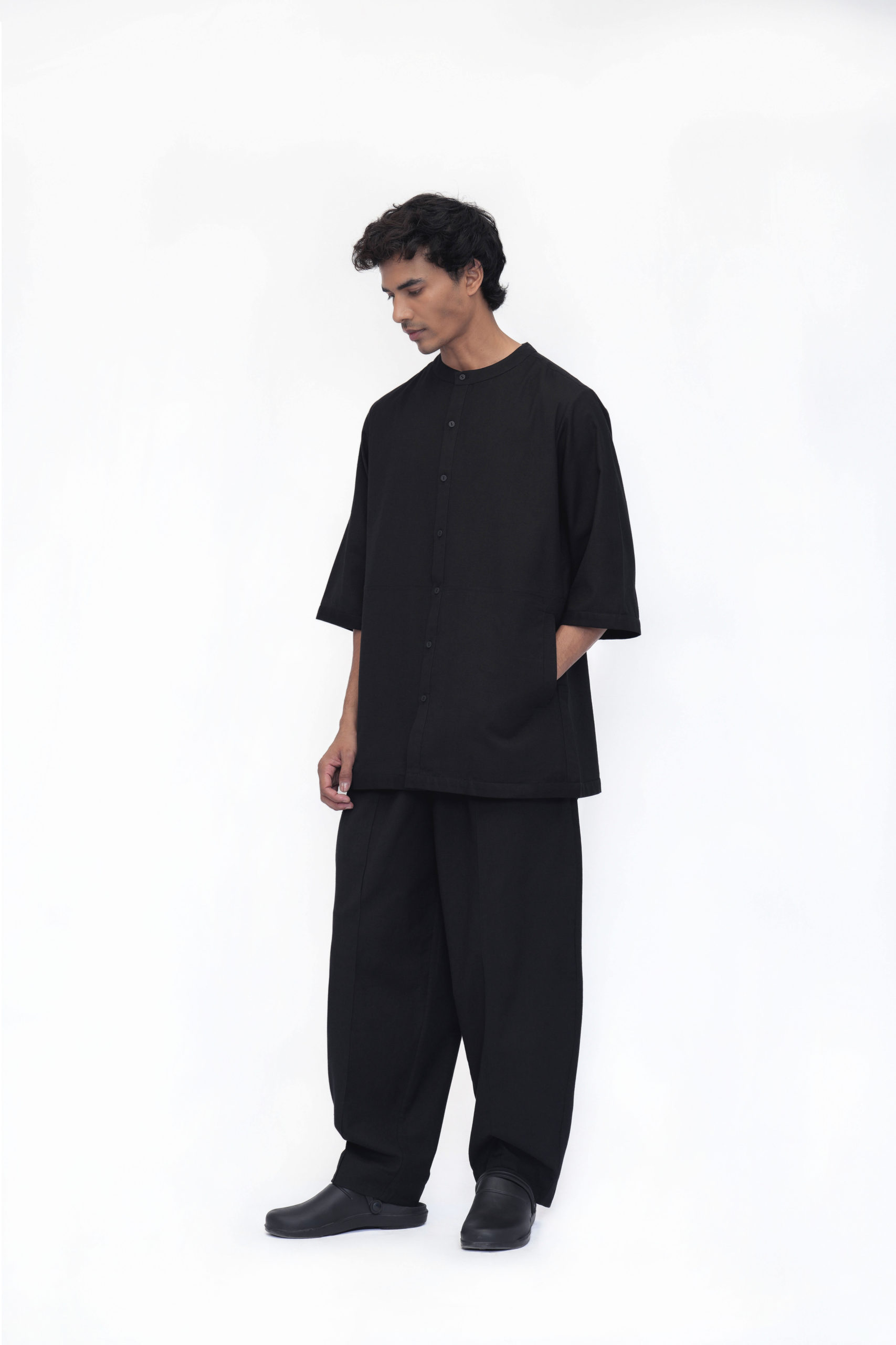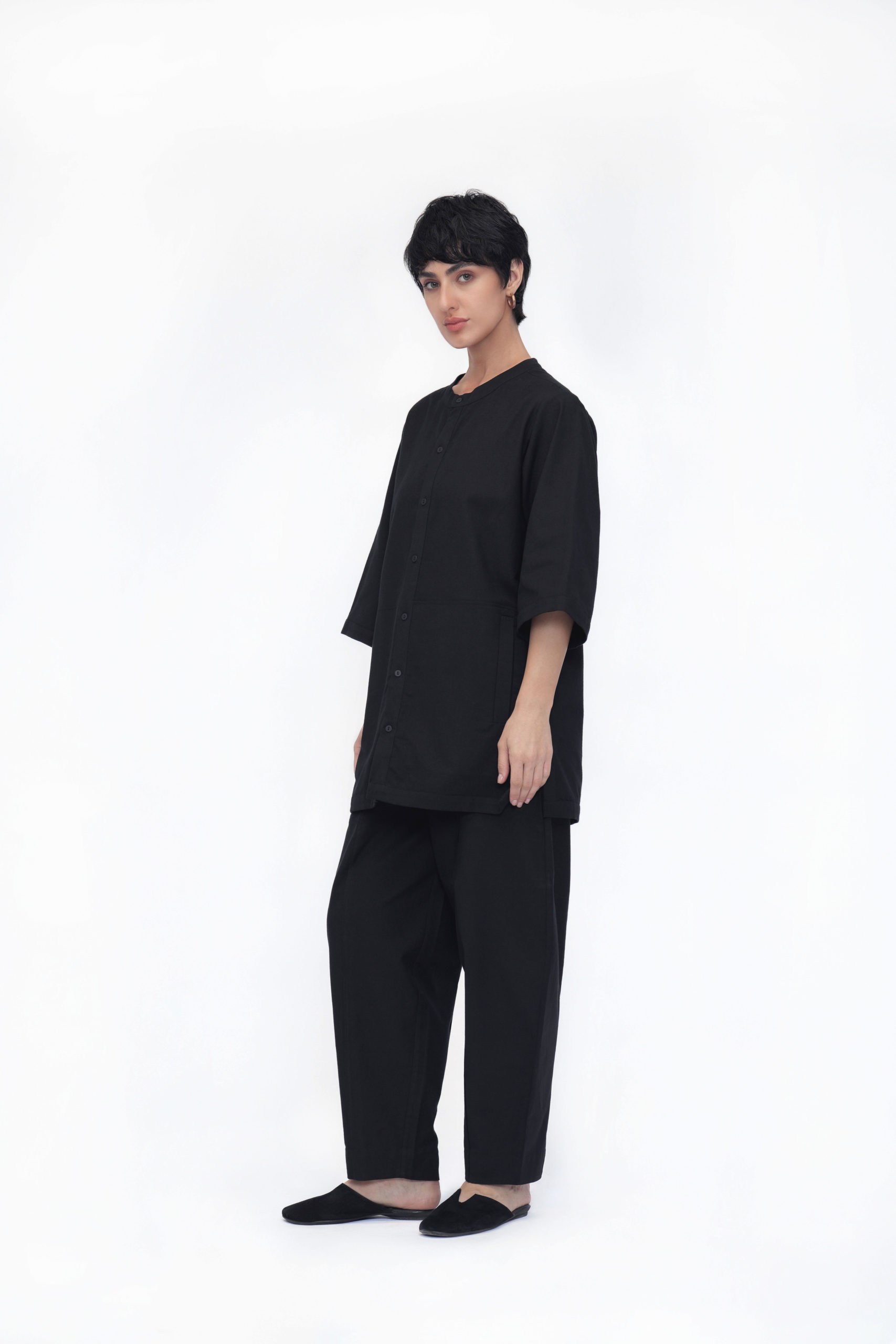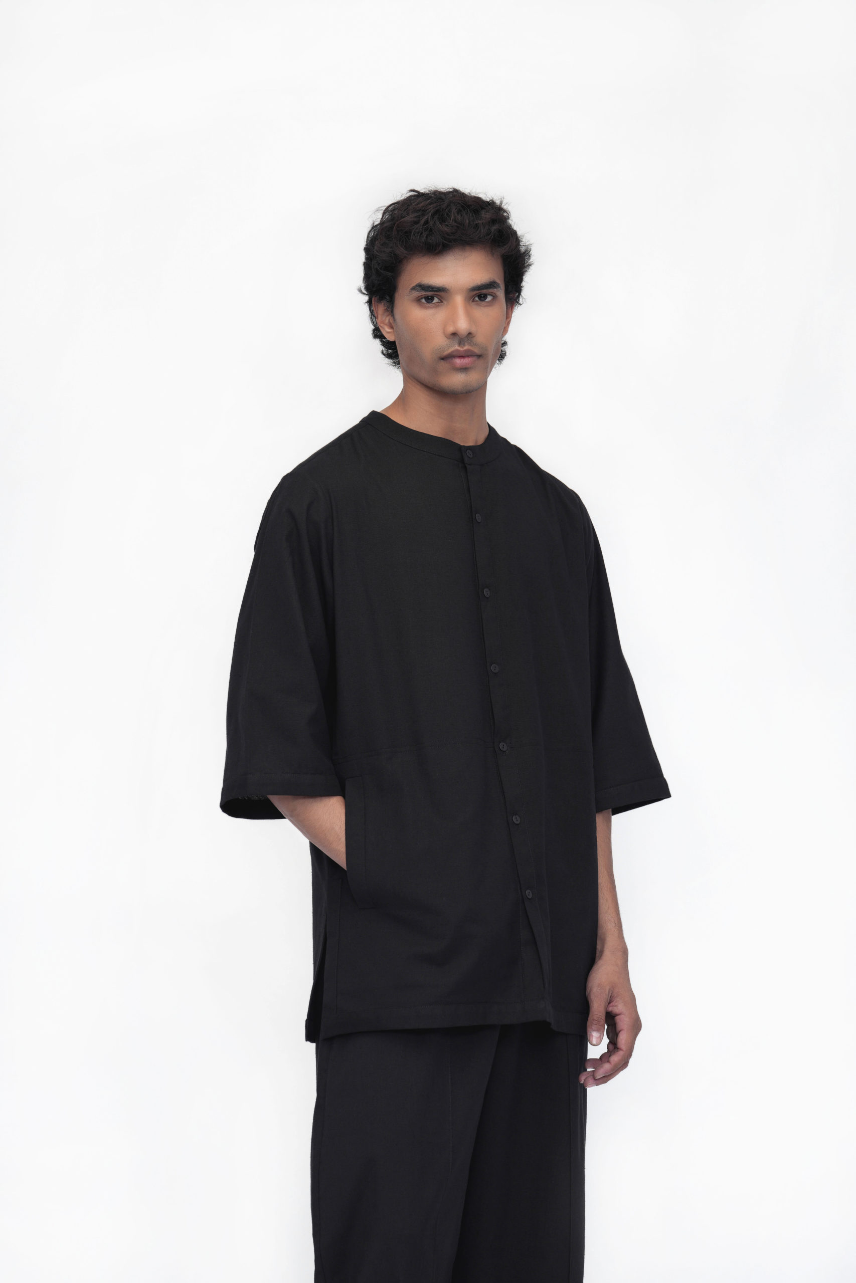 Ichi is a relaxed-fit unisex shirt featuring a band collar, binding finish, and practical front welt pockets. With three-quarter sleeves, a back yoke with box pleat, and side slits, it combines comfort with subtle structure for effortless style.
