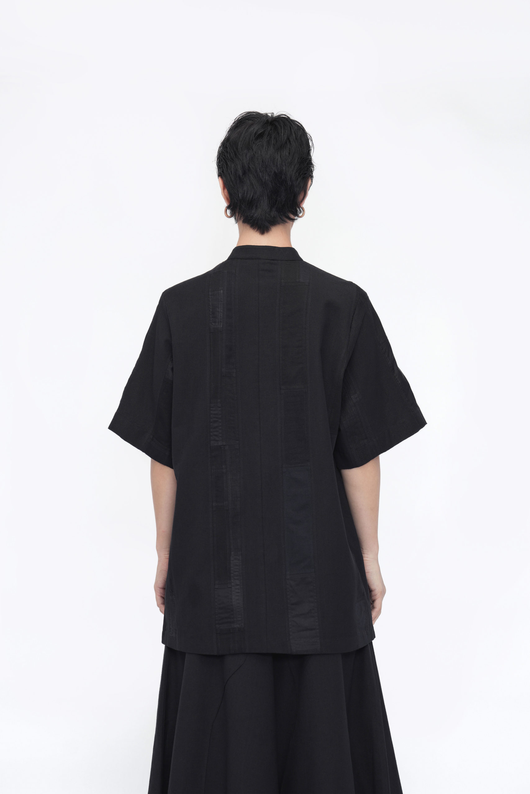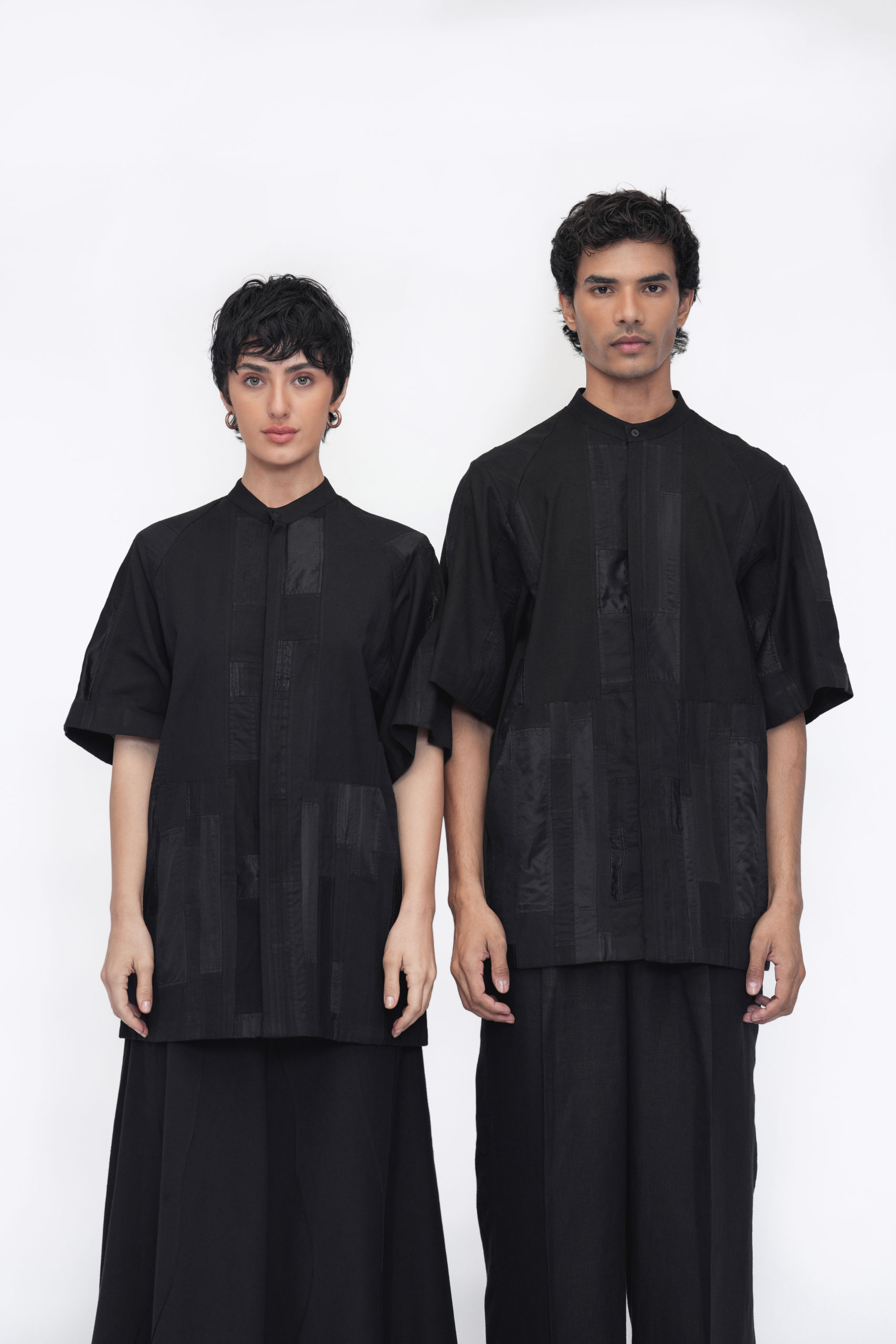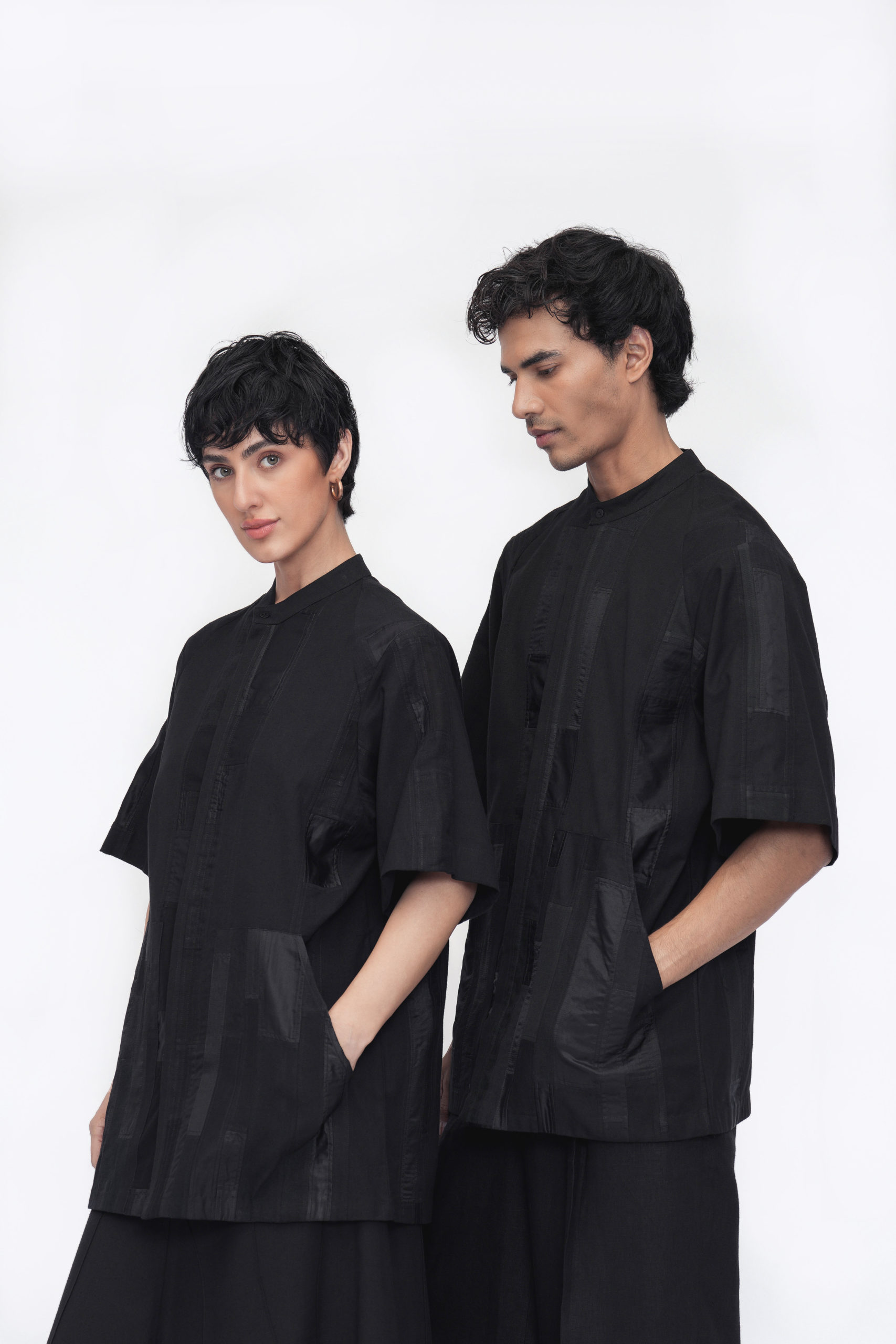 Relaxed-fit unisex top featuring raglan sleeves, a band collar, and a front concealed placket. Designed with half sleeves, patch pockets, and a back center seam. Crafted from a unique patchwork fabric blend of cotton, mashru silk, linen, cotton twill, and handloom cotton.