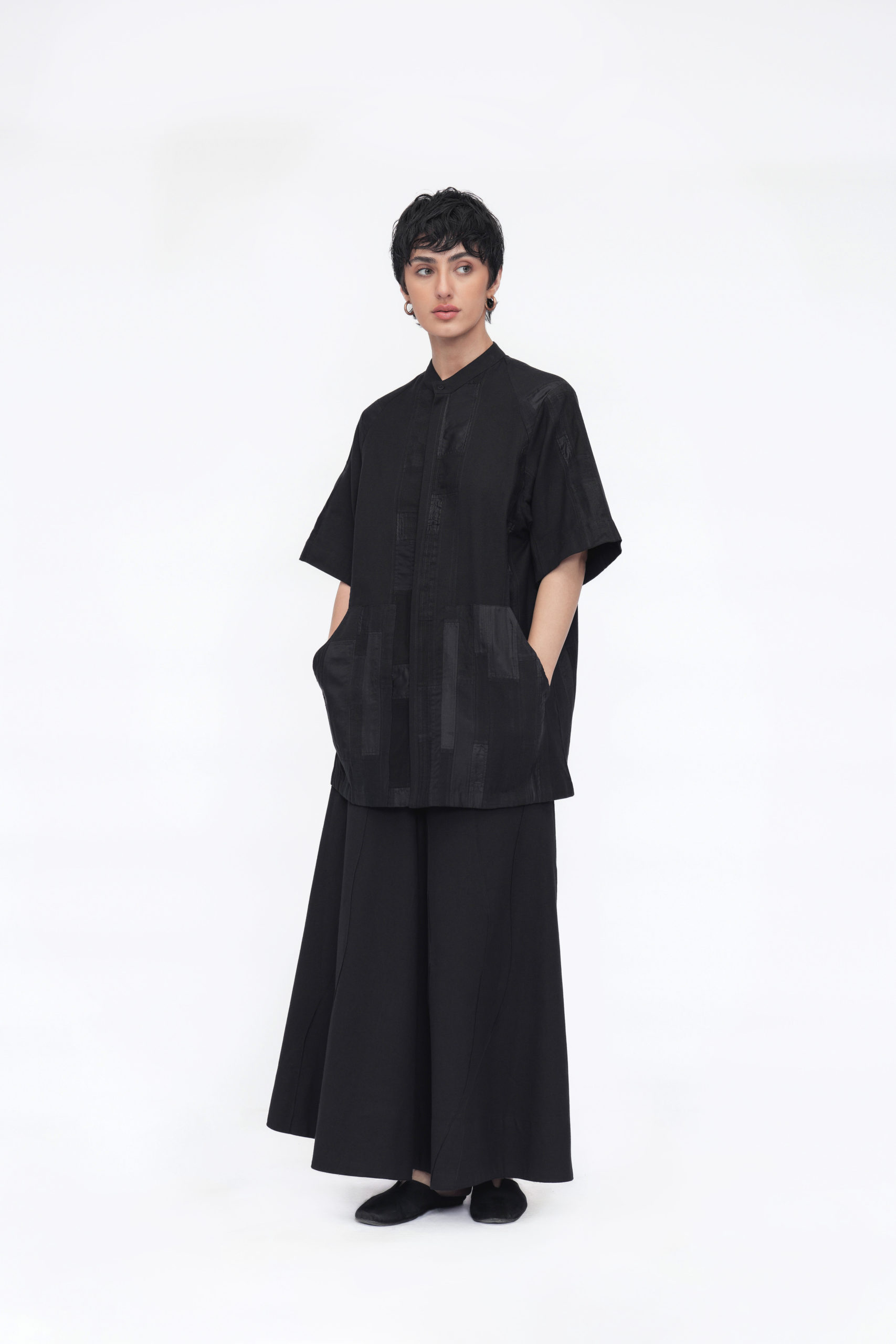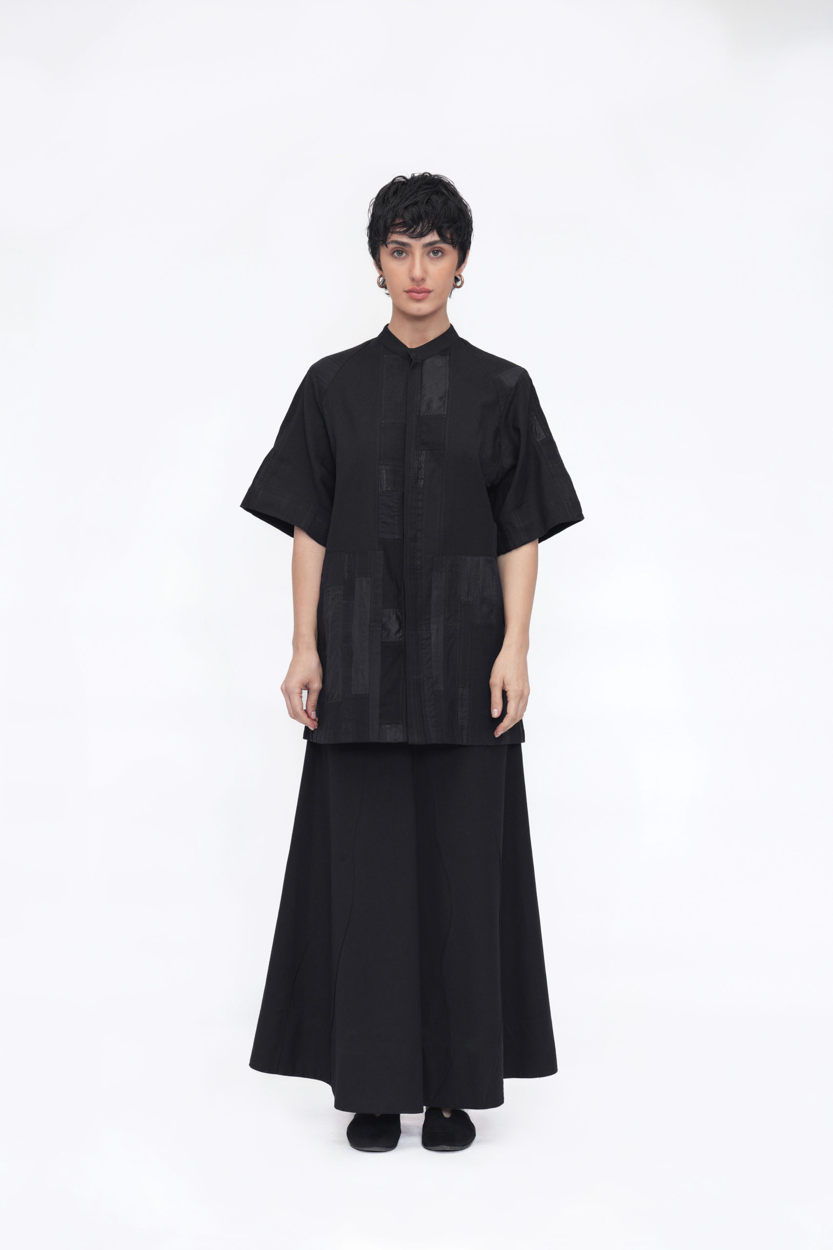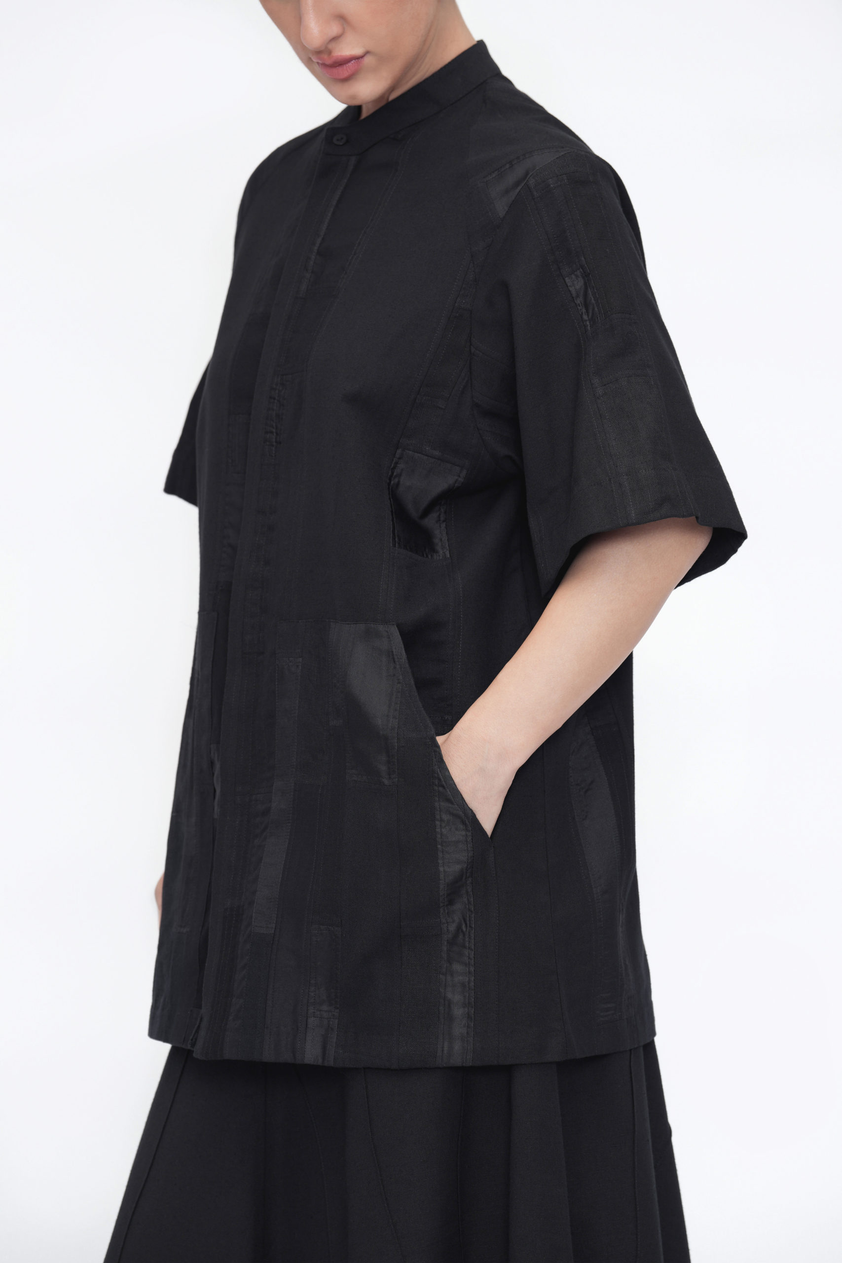 Relaxed-fit unisex top featuring raglan sleeves, a band collar, and a front concealed placket. Designed with half sleeves, patch pockets, and a back center seam. Crafted from a unique patchwork fabric blend of cotton, mashru silk, linen, cotton twill, and handloom cotton.