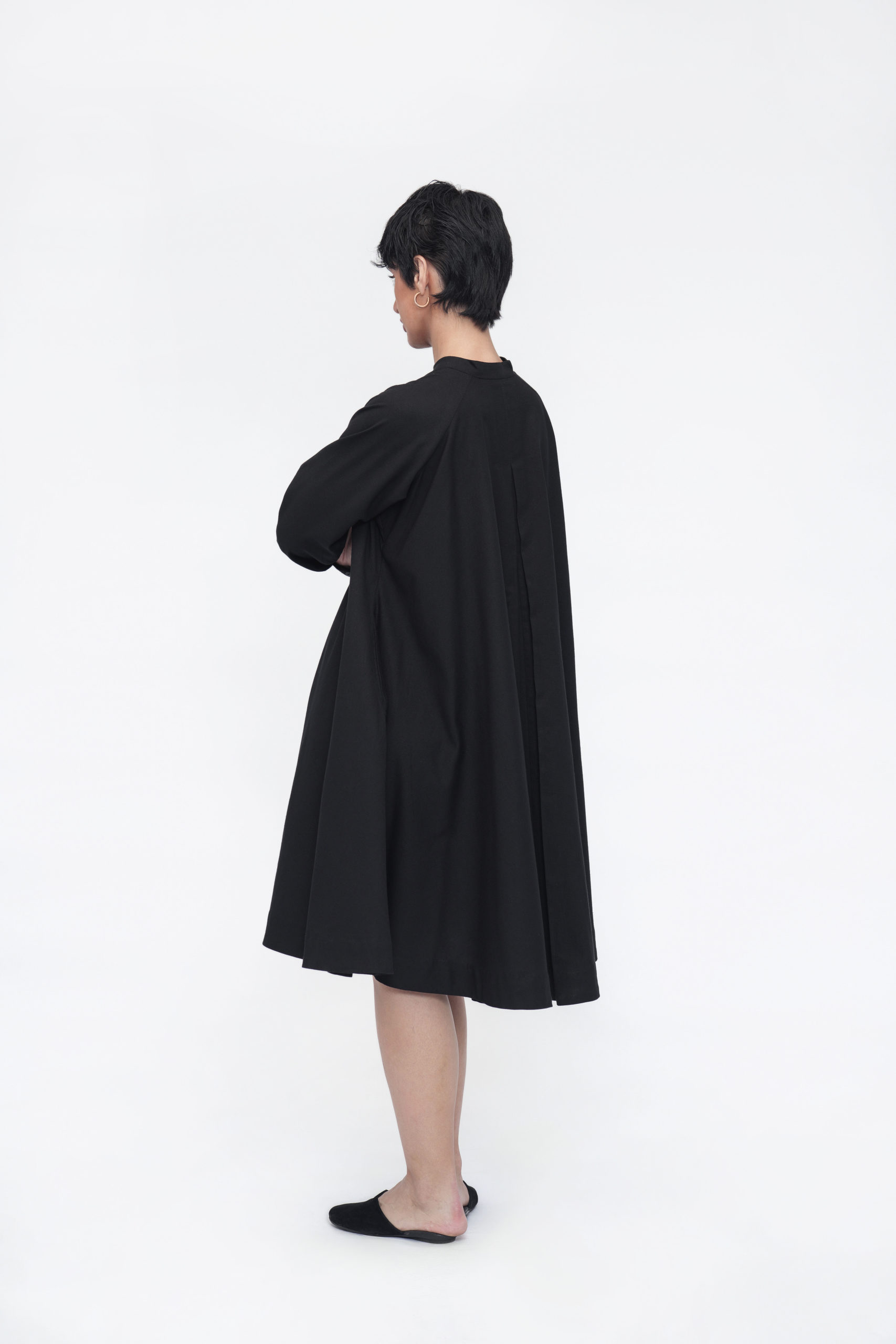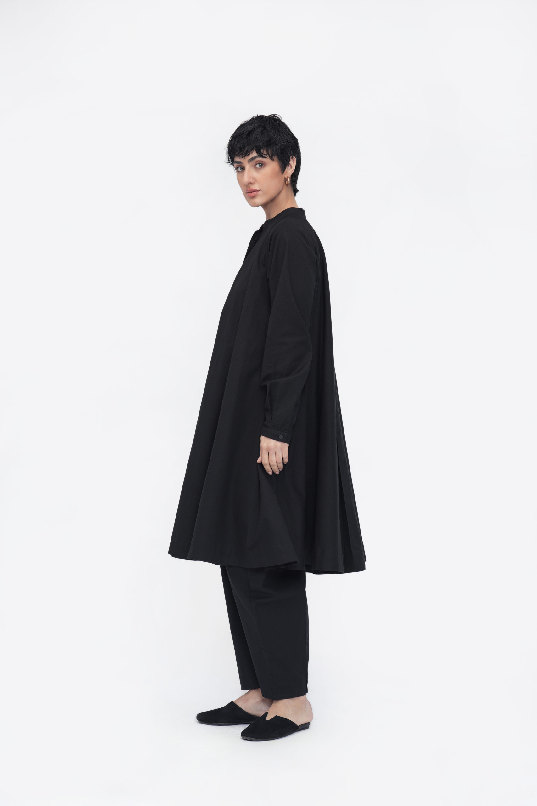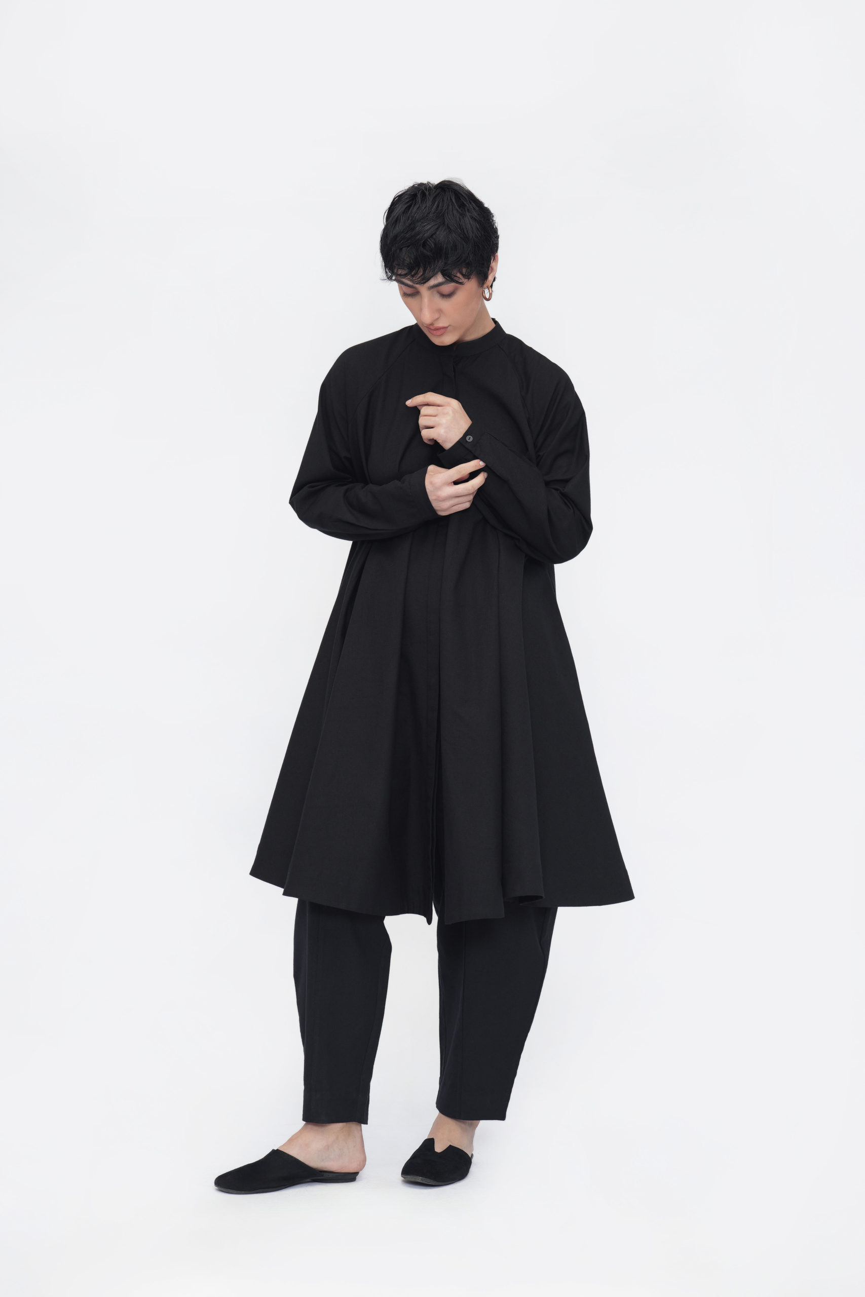 An oversized women’s tunic in breathable Cotton Flex, featuring a relaxed tent silhouette. Designed with a round neck, raglan full sleeves with cuffs, and a concealed front placket. Equipped with side seam pockets and a center back seam with box pleat, this knee-length piece combines comfort and refined style.