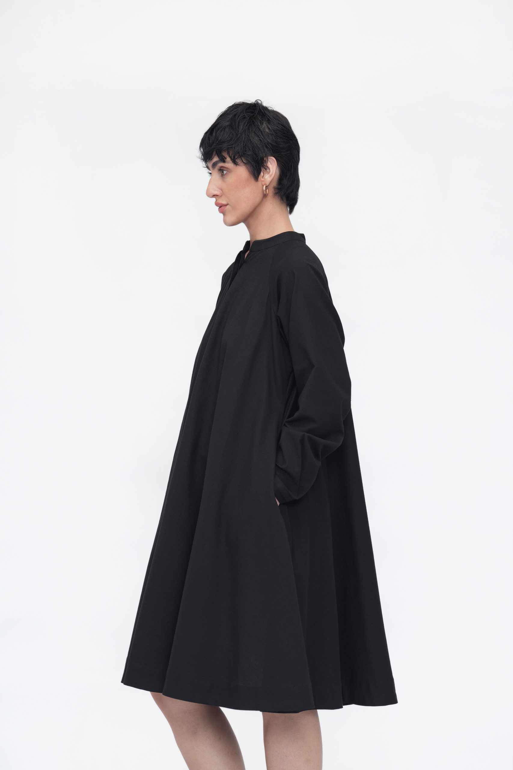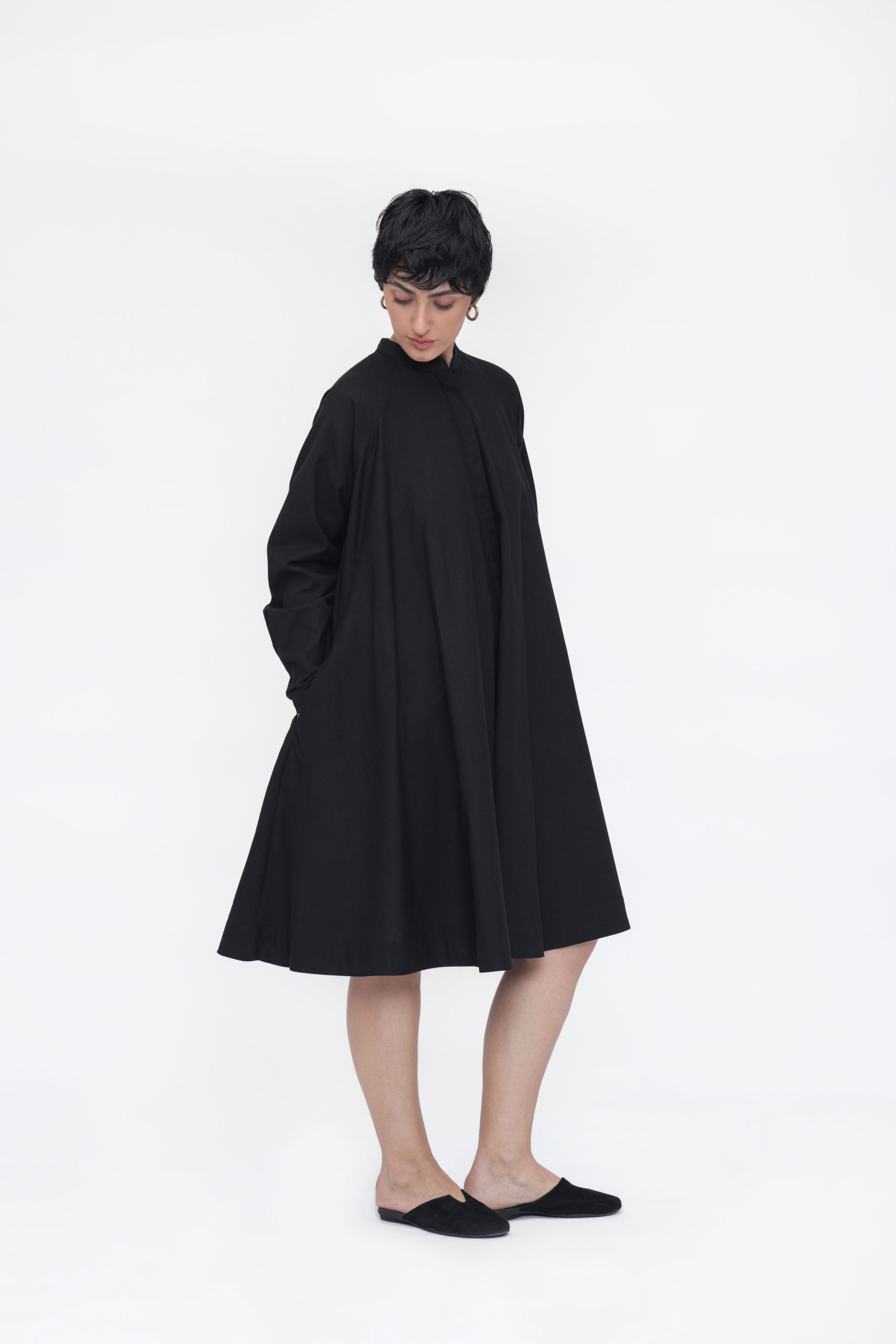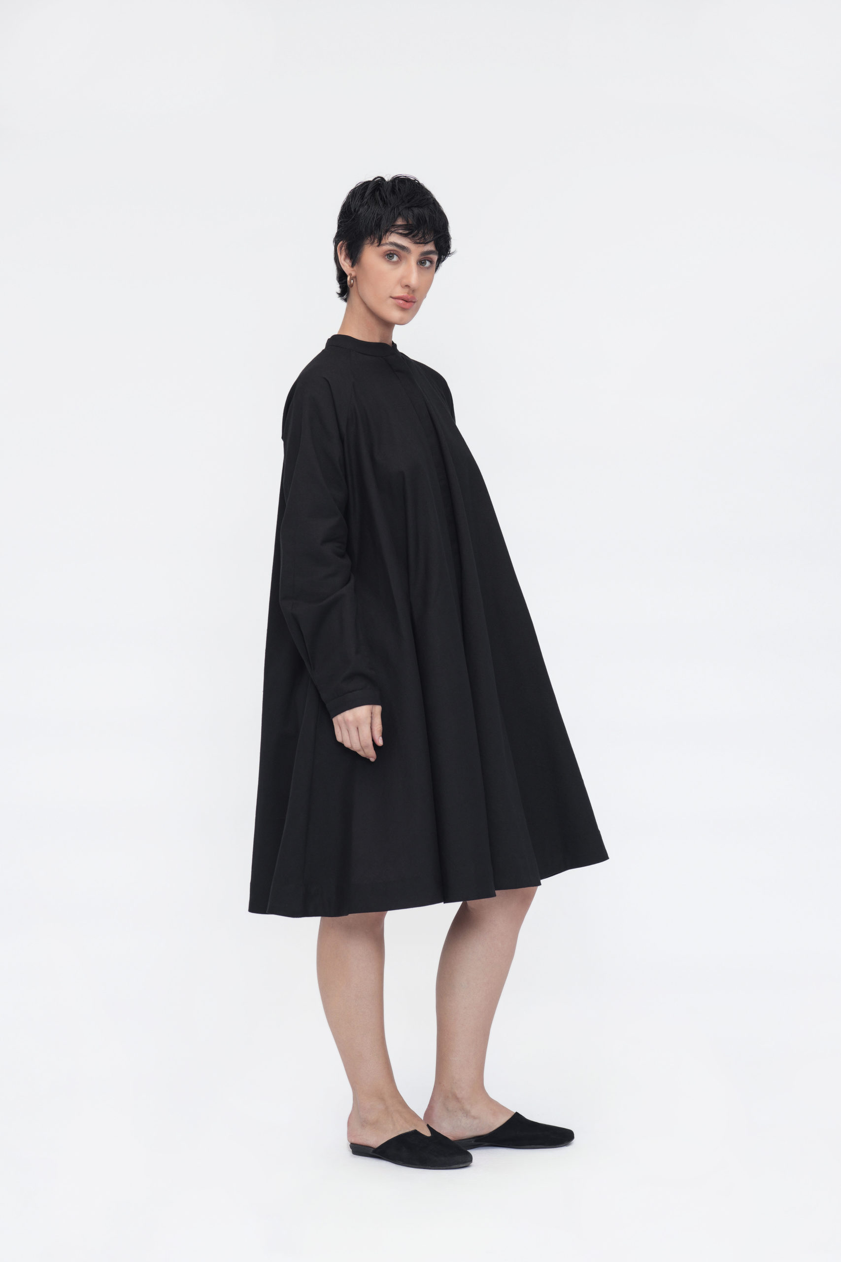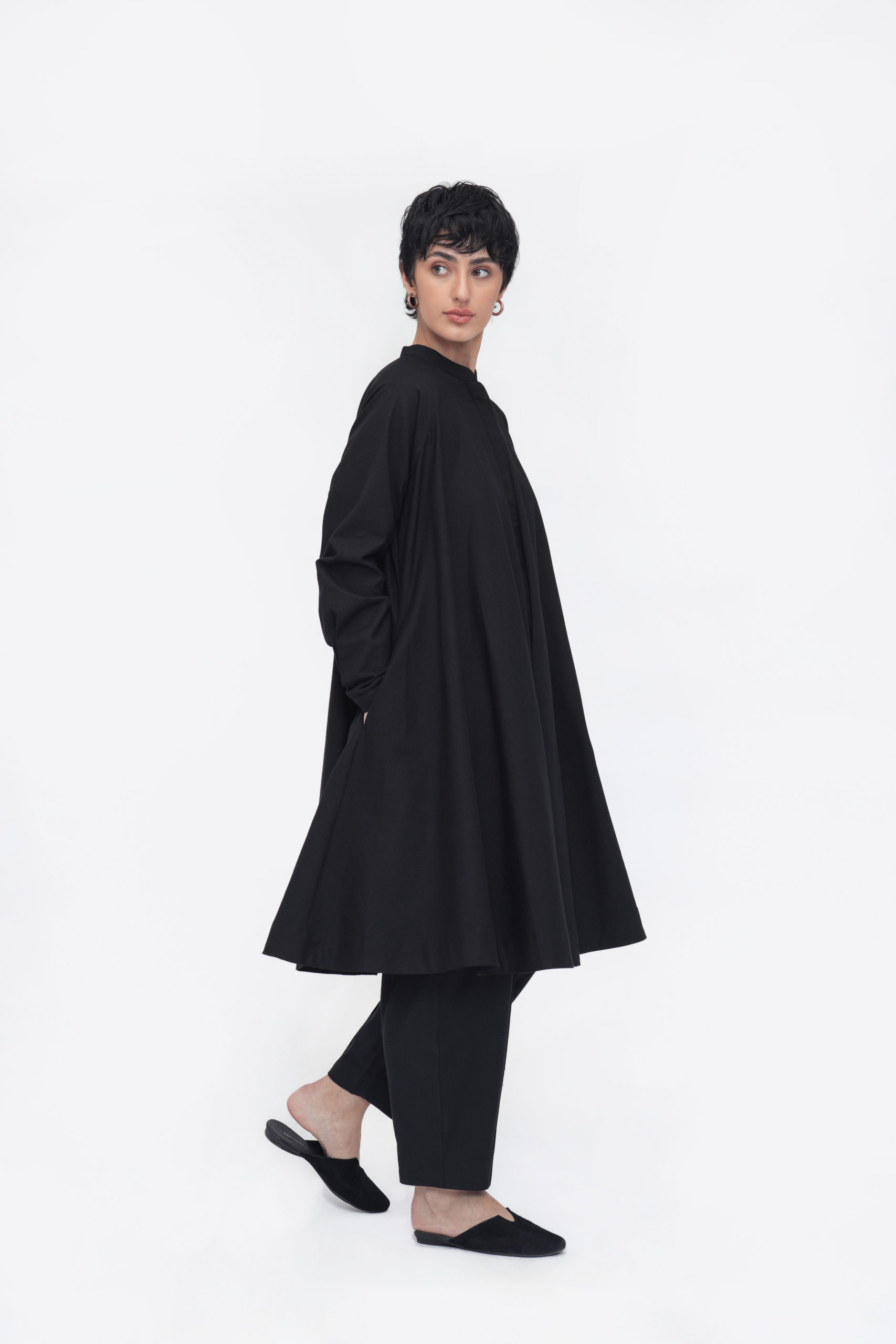 An oversized women’s tunic in breathable Cotton Flex, featuring a relaxed tent silhouette. Designed with a round neck, raglan full sleeves with cuffs, and a concealed front placket. Equipped with side seam pockets and a center back seam with box pleat, this knee-length piece combines comfort and refined style.