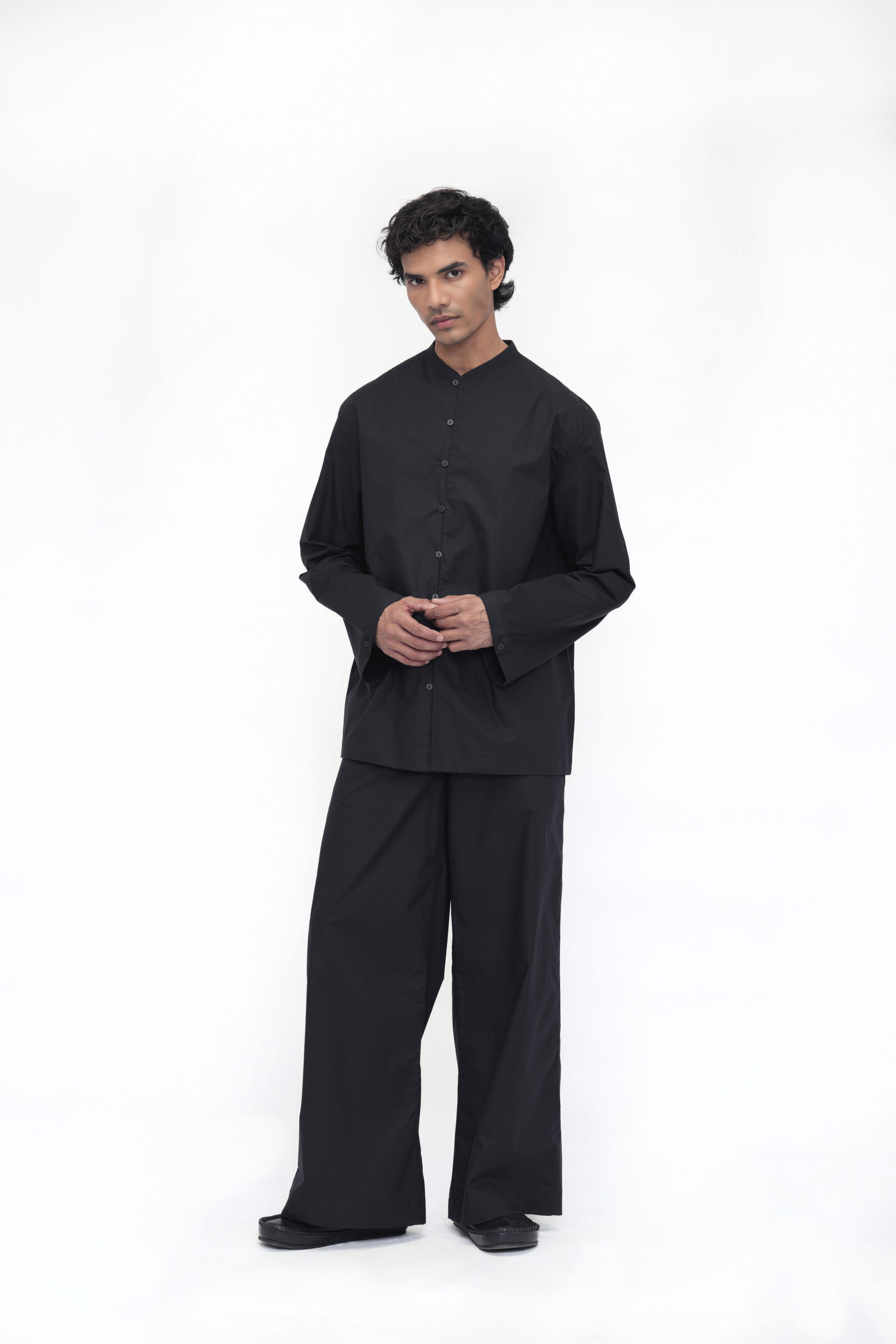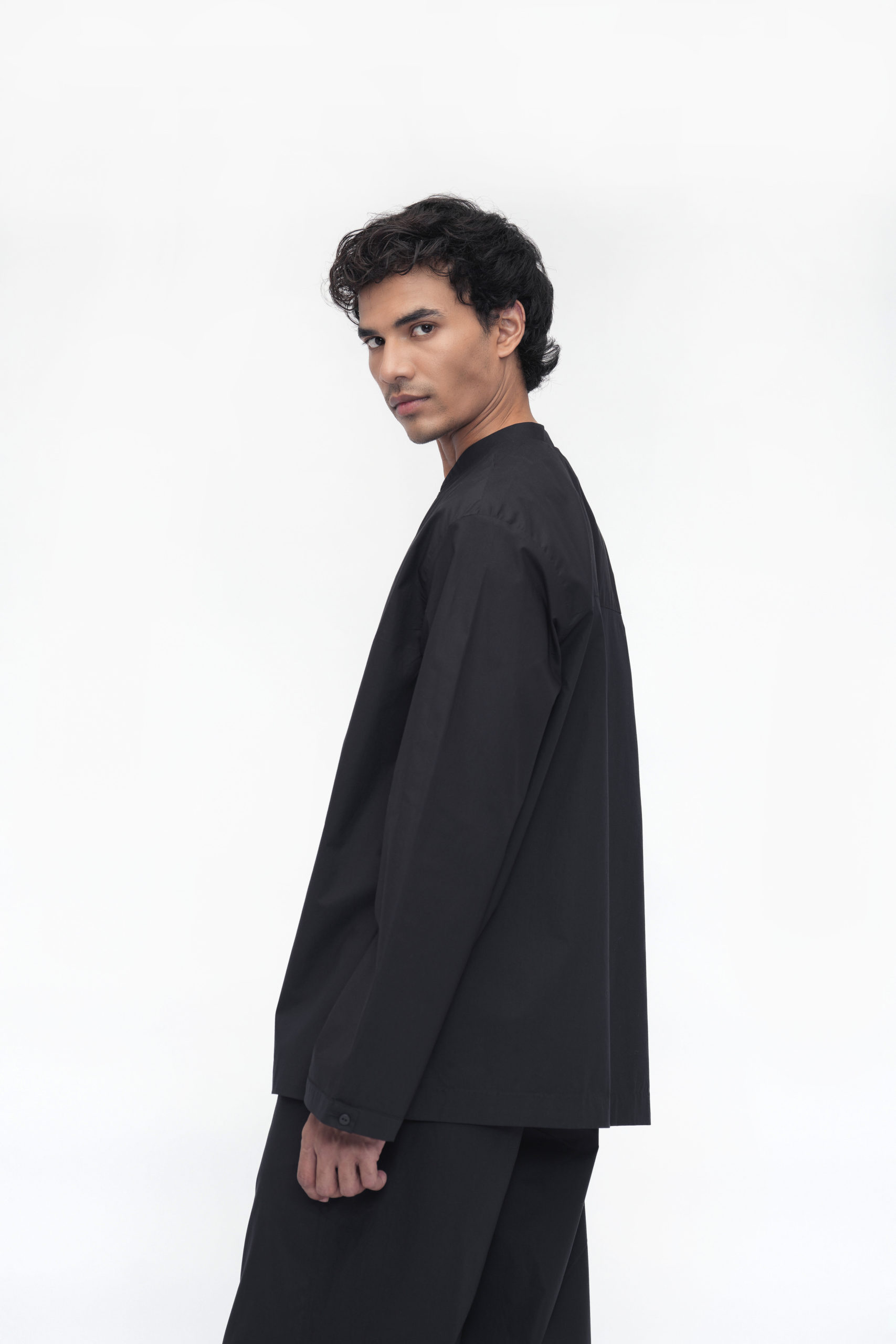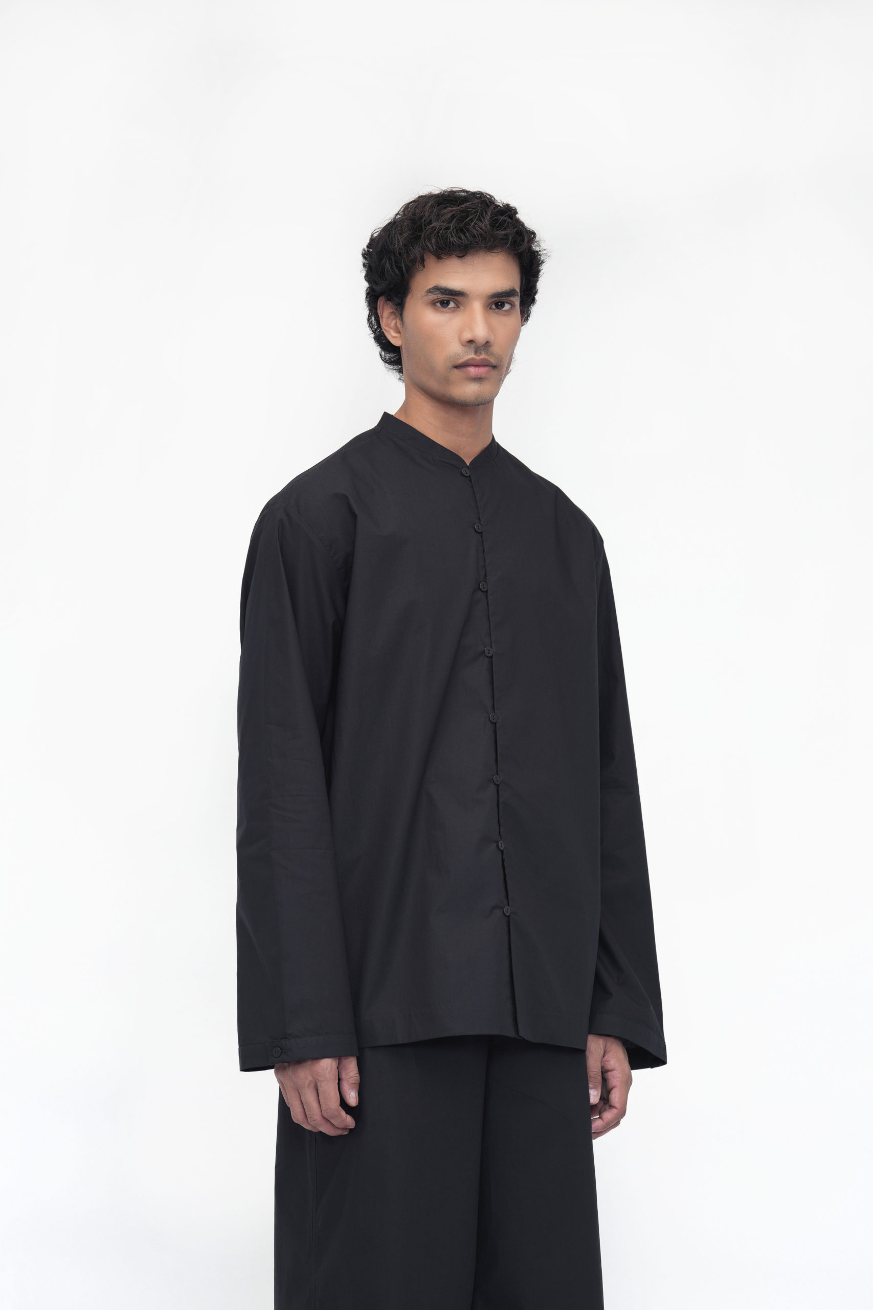 A relaxed-fit unisex shirt designed with a stylized band collar and a front placket featuring loop buttons. Full sleeves are finished with binding at the hem, and a back yoke adds subtle structure. The Yonten shirt blends minimalist design with everyday comfort for effortless style.