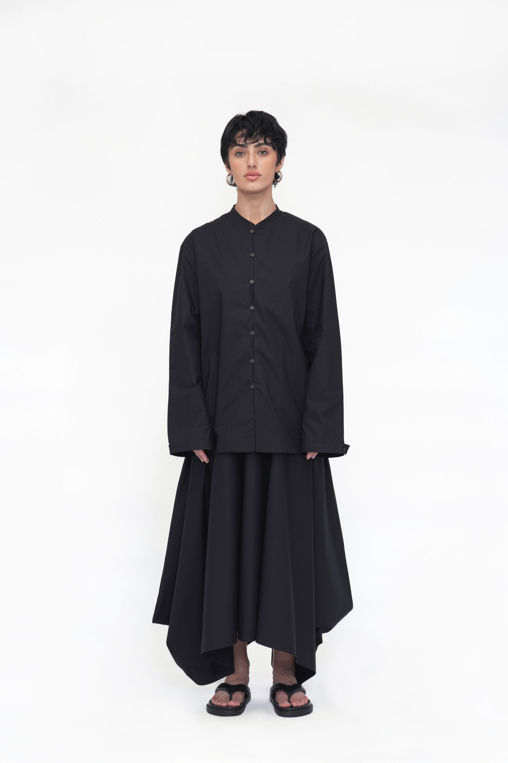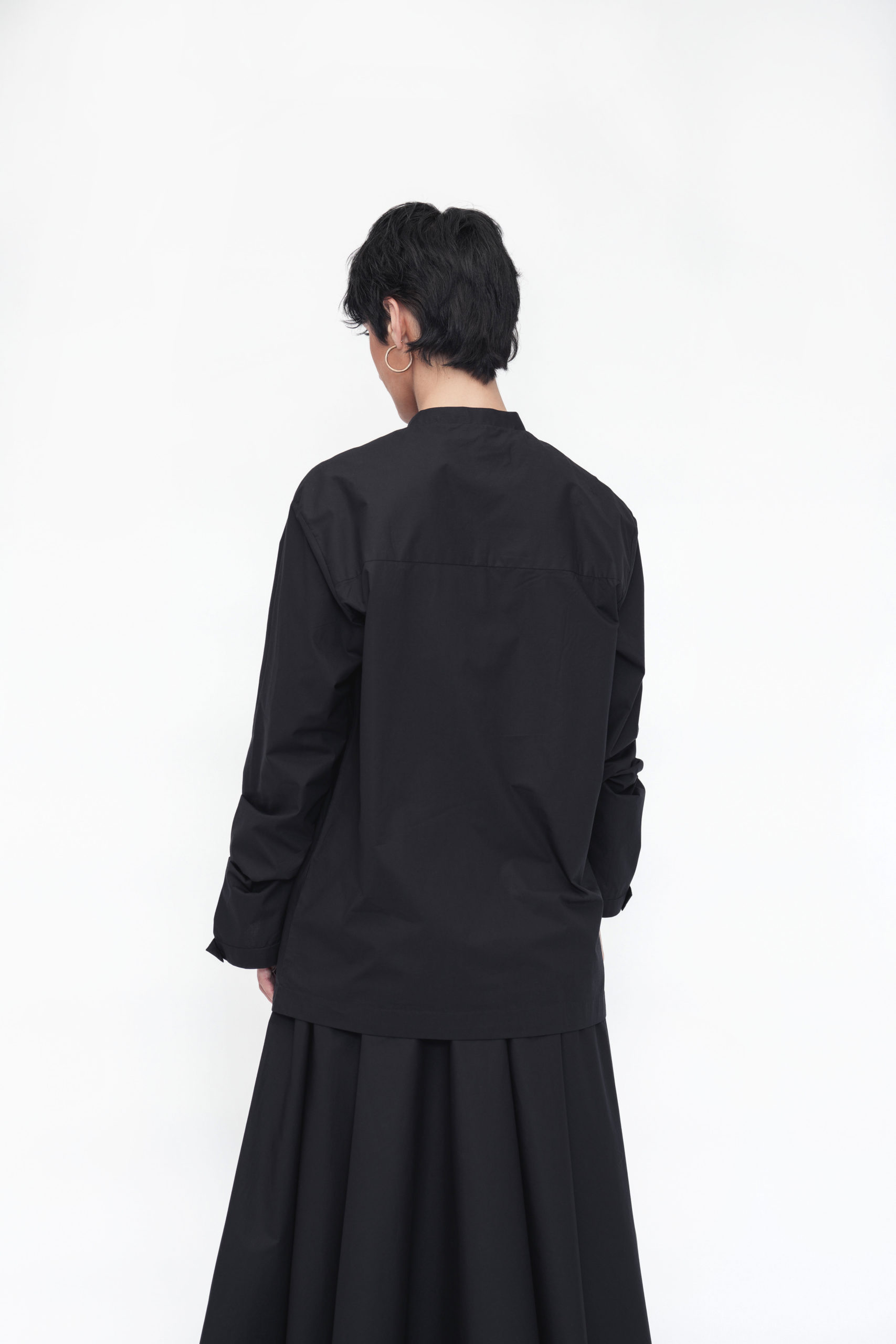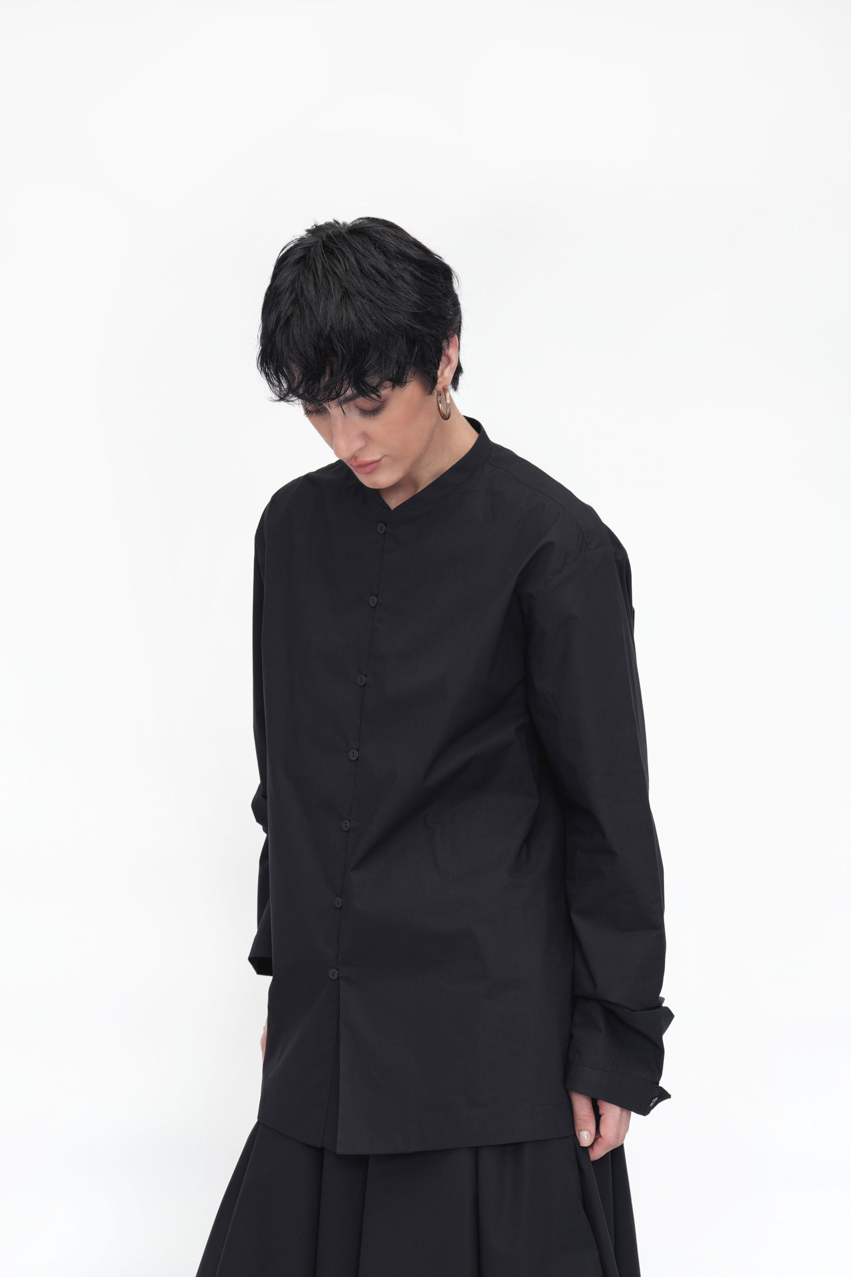 A relaxed-fit unisex shirt designed with a stylized band collar and a front placket featuring loop buttons. Full sleeves are finished with binding at the hem, and a back yoke adds subtle structure. The Yonten shirt blends minimalist design with everyday comfort for effortless style.