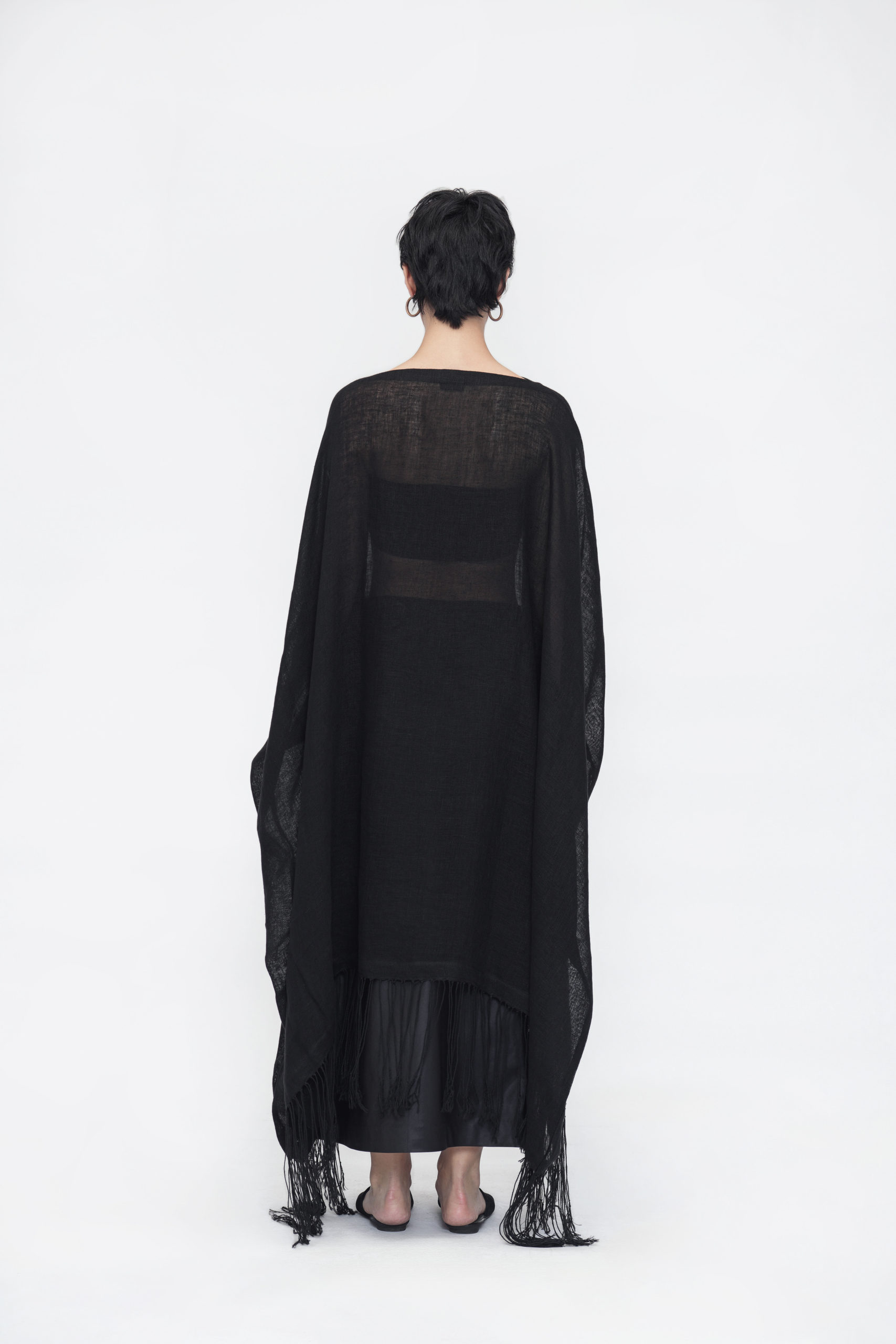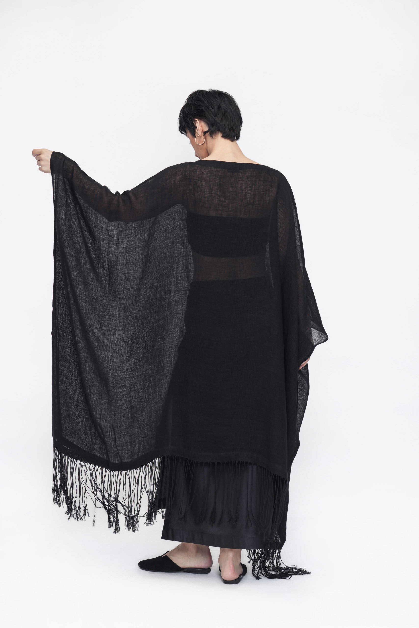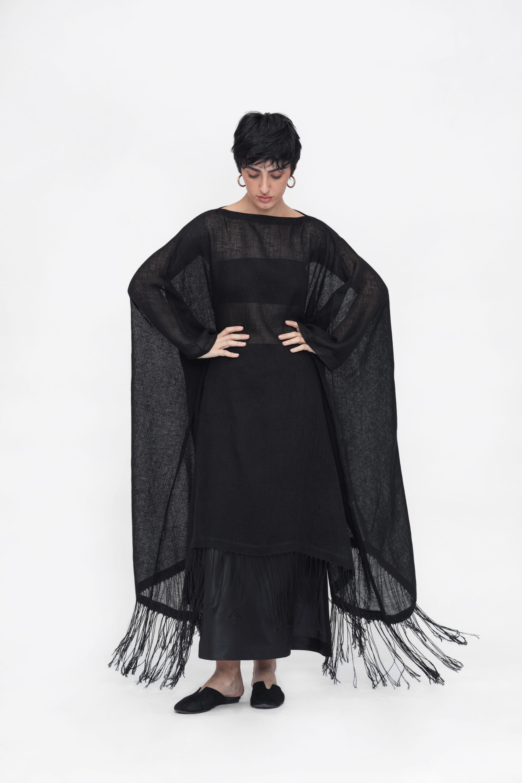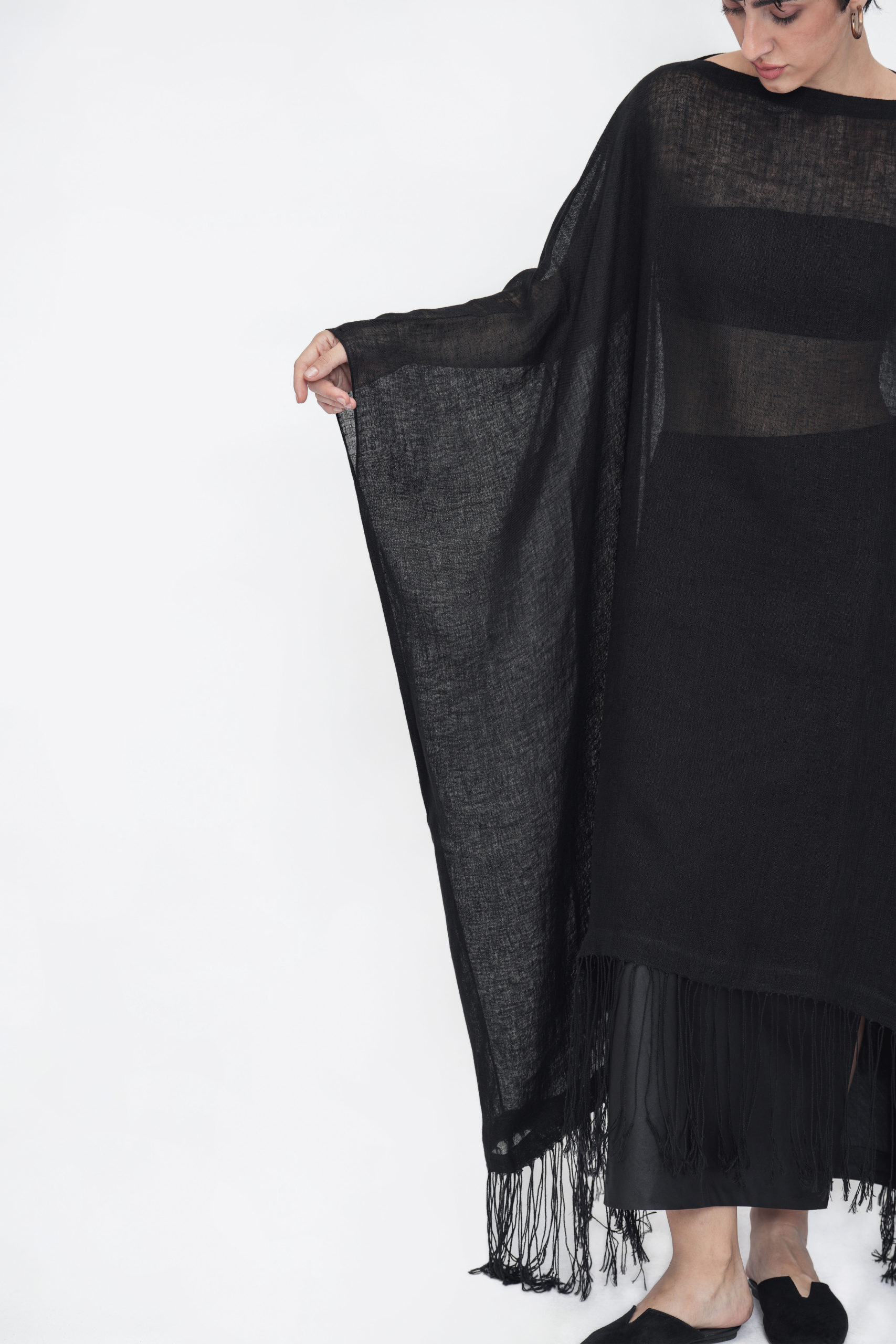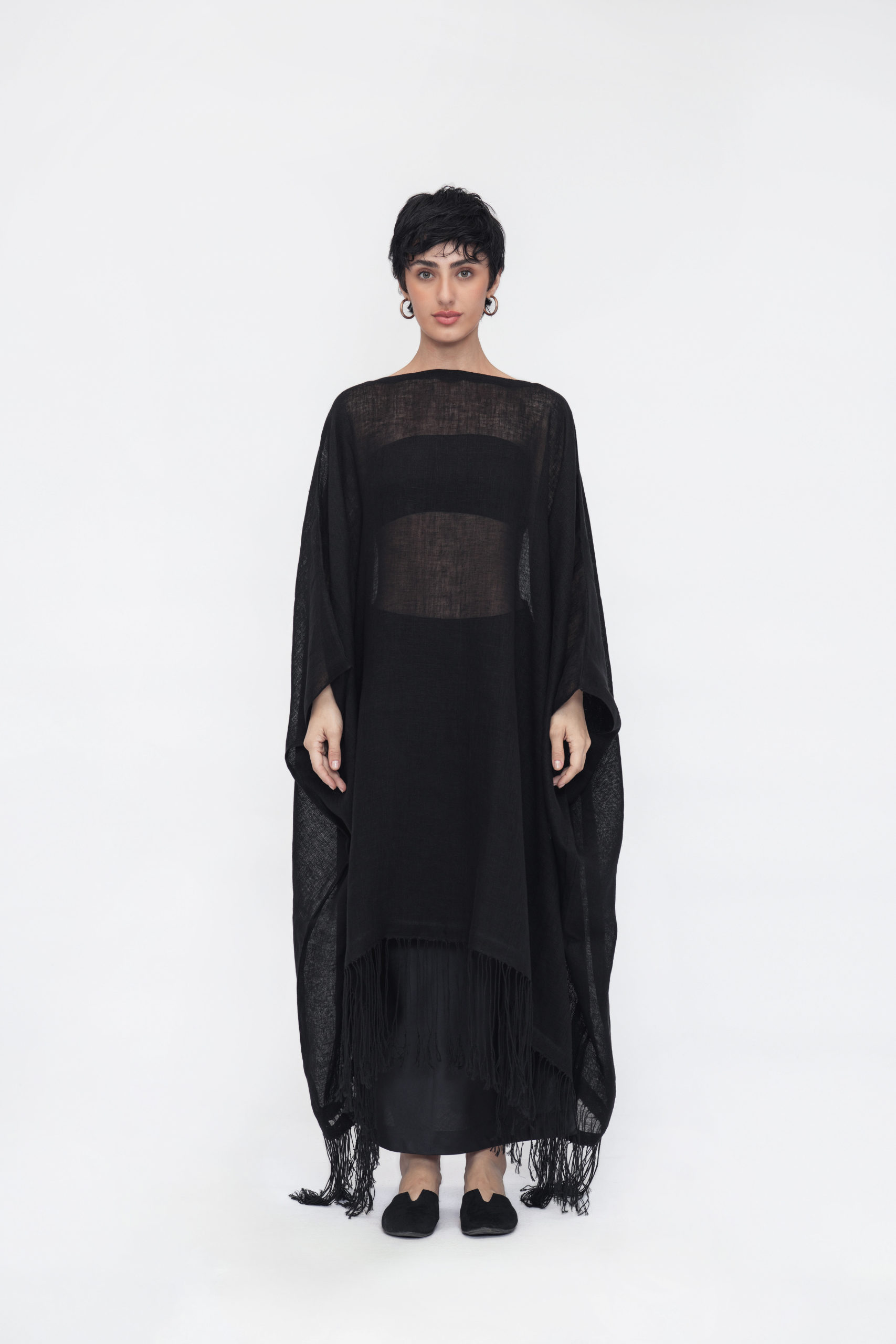 An airy free-size kaftan in lightweight linen gauze, designed with a soft boat neck and delicate fringe detailing along the hem. A flowing silhouette meant for slow days and easy movement.